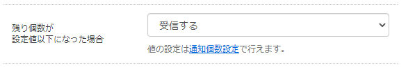 在庫の残り個数が設定値(初期設定は1個)以下になった場合、0個(品切れ)になった場合のメール通知を「受信する」か「受信しない」に切り替えることができます。