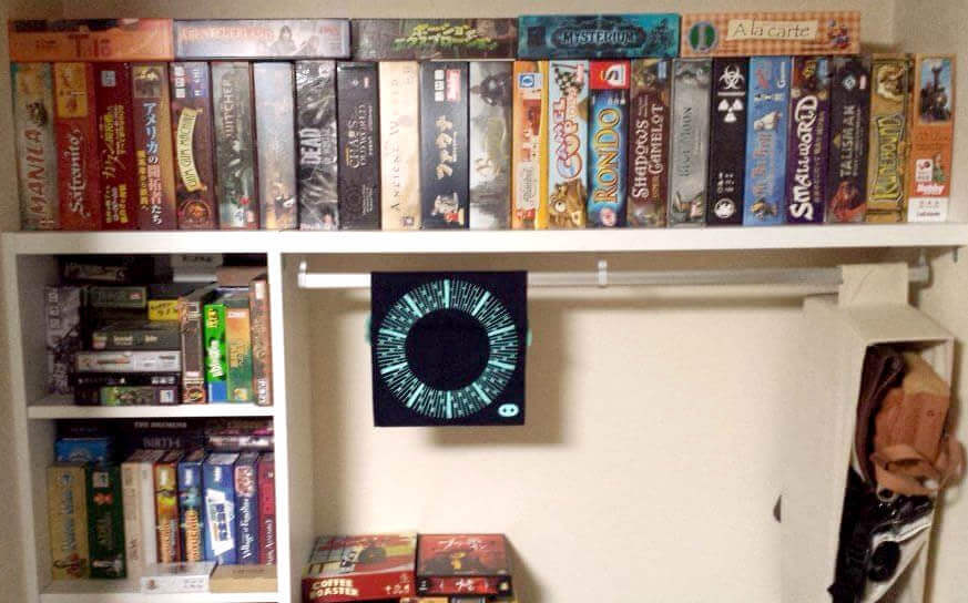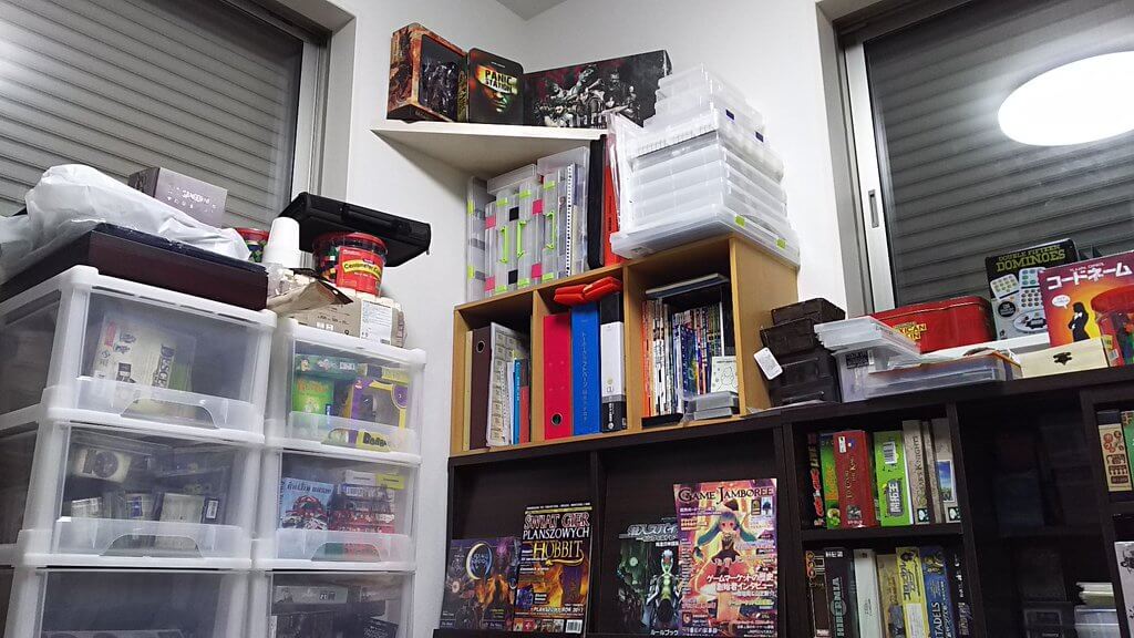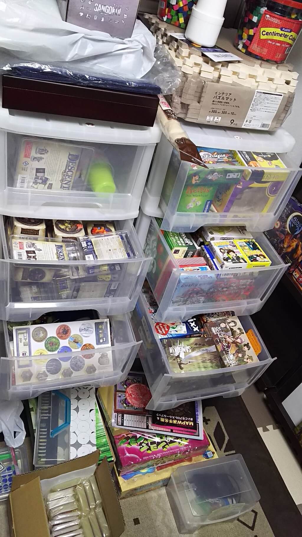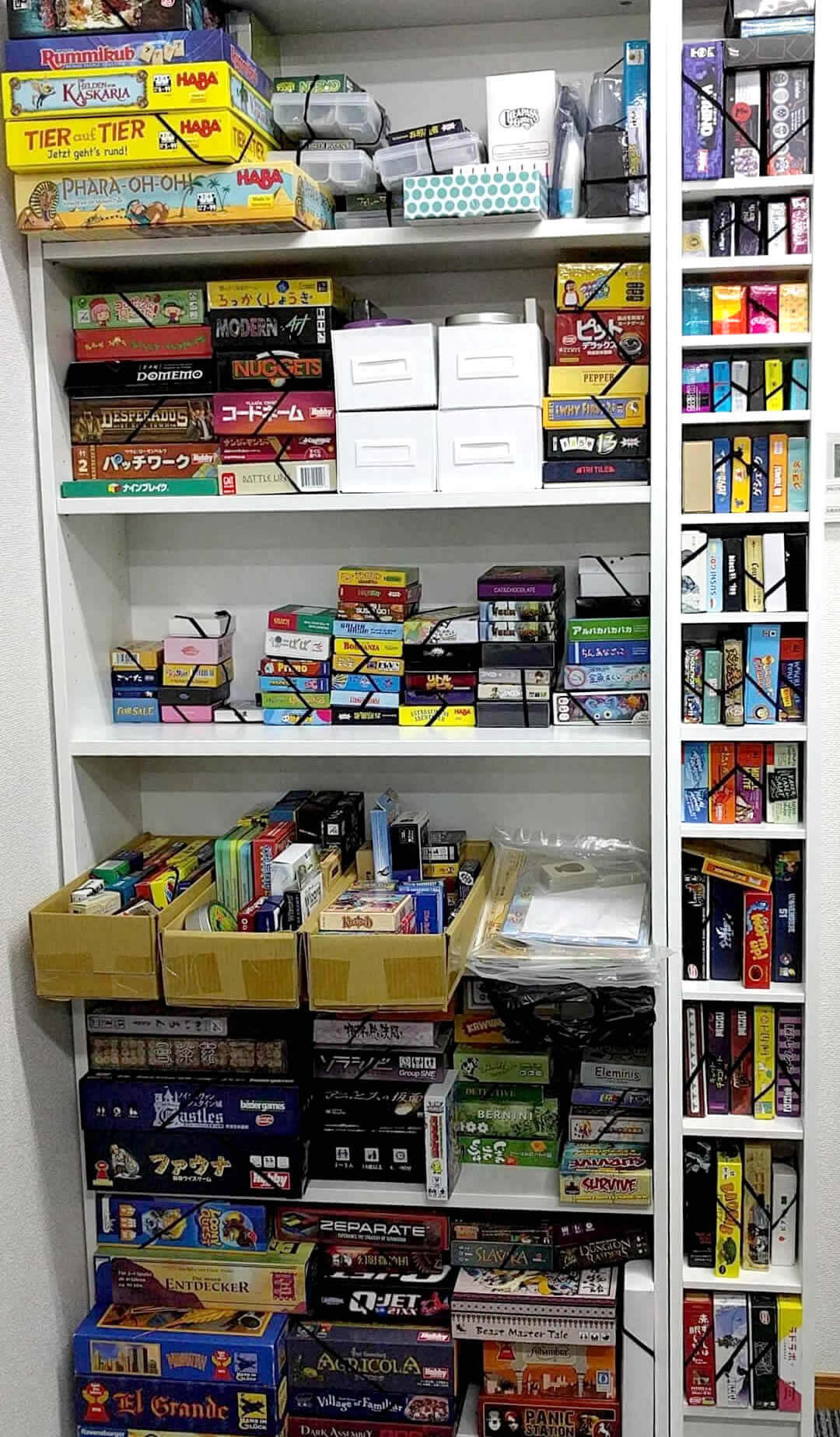 300個も越えてくると、ウォークイン・クローゼットはウォークイン・ボードゲームと化すようです。サイズや形状にバラつきが出やすい中箱系は少し収納に困った様子が伺えます(左側の棚・中段と最上段)。ドブルやイチゴリラ等の特殊な箱はそこらへんに収納してあるのかもしれません。綺麗に整頓された小箱用の布製引き出しは使い勝手がよさそうです。小箱は重ね置きよりもこういう収納が取り出しやすく劣化もしにくそうですね。