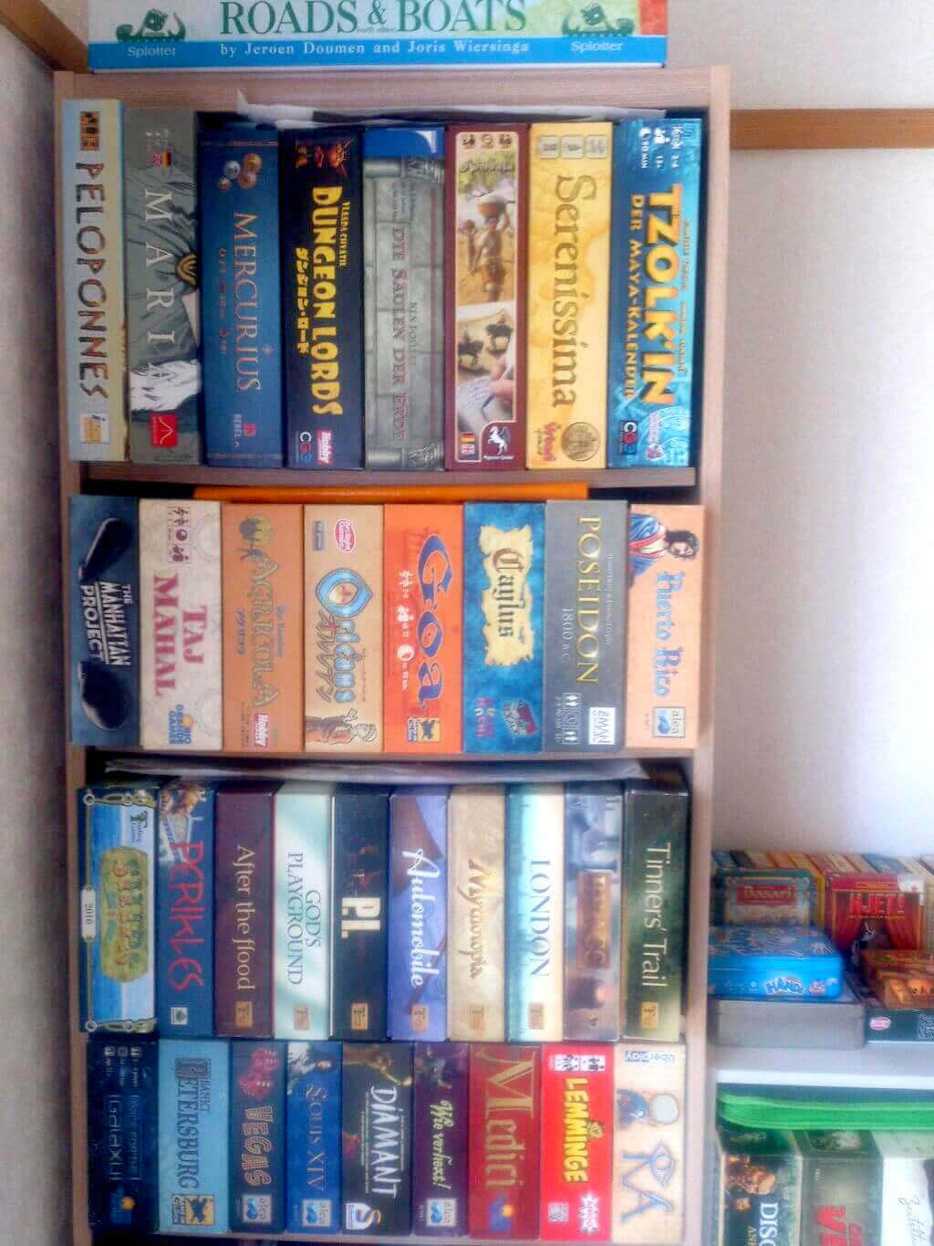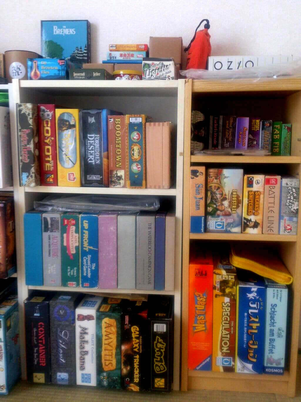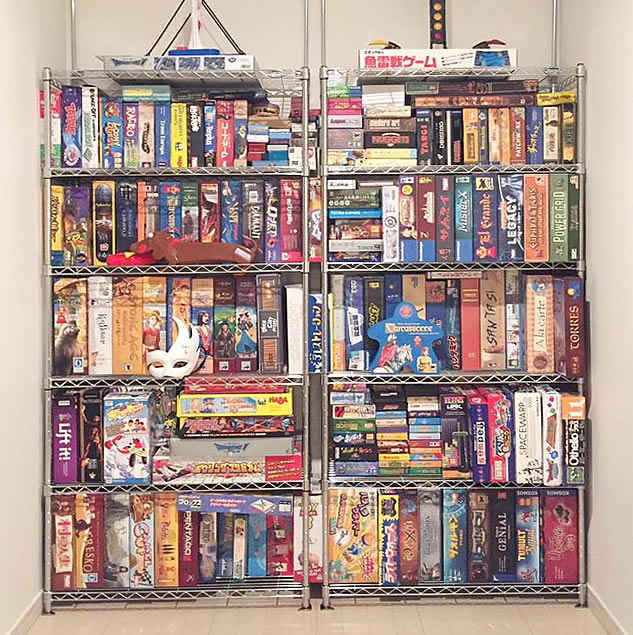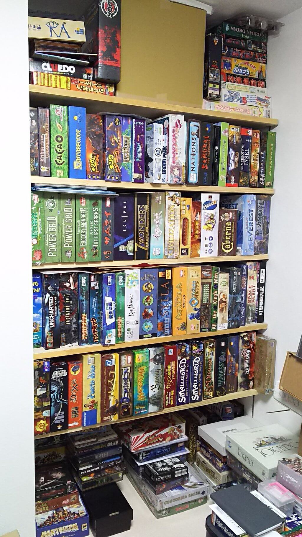 お気に入りのものをこちらの棚に入れているそうです。箱のサイズごとに棚を使い分けていて、よく見ると微妙なサイズ違いも綺麗に収納しています。左から背の順に並べ、パット見が階段状になっていて良い感じです。低い棚の最上段には小型のボードゲームや、特殊な形状をしたボードゲームが敷き詰められています。