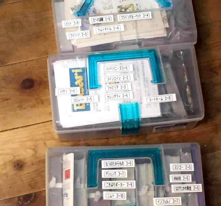 箱置き&小物入れボックスに移し替えるハイブリッド型ですが、省スペース重視の運用をされているようですね。棚が手狭になるに連れて移し替えるといった運用をされているのでしょうか。ちなみに移し替えた小物入れボックスにはボードゲーム5個~10個分くらいのコンポーネントが圧縮収納されています。つまりあのクリアケース達を箱に戻したら、棚がもう2,3個くらい必要になるということです。