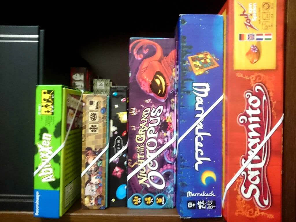 小箱中心とのことで、収納ボックスを棚に突っ込むというハイブリッド収納で運用されています。大箱は名作系が並んでいるように見えます。棚をよくみるとアブルクセンの裏にもボードゲームが隠れていますね。パット見、収納ボックスを入れる棚スペースもぼちぼち無くなりそうなので、間もなく収納棚が増えそうな気がします。