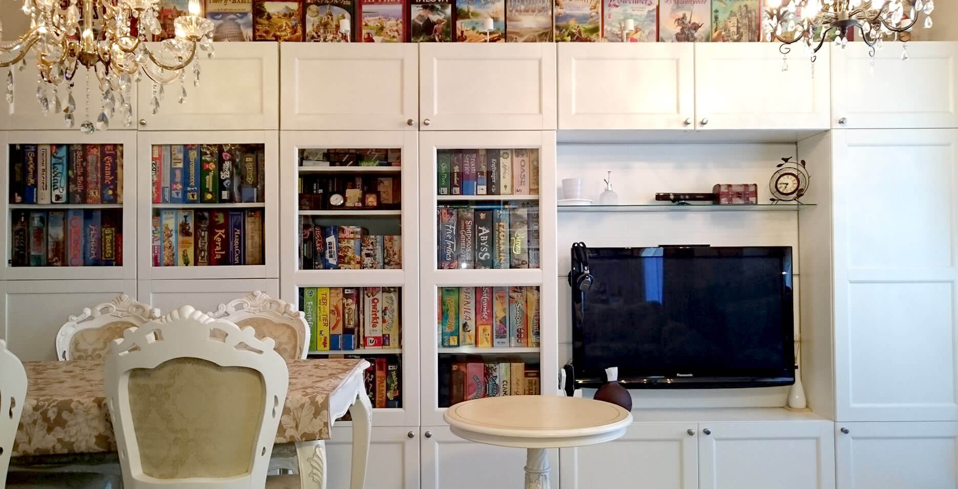 ふつくしい。ビューティホー。インテリア系の雑誌に出てきてもおかしくないくらいキレイです。この部屋でブラーノ島をプレイしてみたくなるのは私だけでしょうか。棚内はボードゲームの丈がほぼ完全一致するもので揃えられています。棚の上には「貿易」「商人」「戦争」などの中世ヨーロッパの史実系ボードゲームが並べられているように見えます。歴史のワンシーンを切り取ったような感じのボードゲームは、私も超どストライクなテーマです。