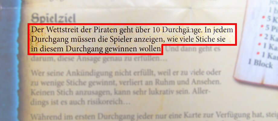 Spielzielにかかれていた内容。Der Wettstreit der Piraten geht über 10 Durchgänge. 続けて In jedem Durchgang müssen die Spieler anzeigen, wie viele Stiche sie in diesem Durchgang gewinnen wollen. という2つの文。