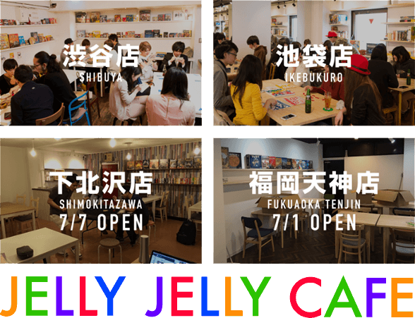JELLY JELLY CAFEは2011年に渋谷店がオープンして以来、2015年に池袋店、2016年7月に下北沢店、福岡天神店が、立て続けにオープンしました。JELLY JELLY CAFEでボードゲームにハマり始めた方も多いようで、ファンの間では「ジェリカフェ」の愛称で親しまれることもしばしばあるようです。ちなみに下北沢店はボードゲームカフェとしては珍しくフランチャイズ契約で運営されています。