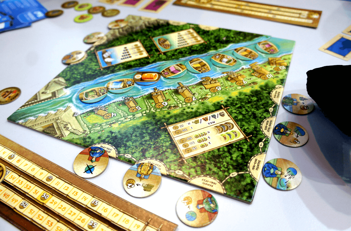 ゲームボード上には揚子江がゆったりと流れており、そこに商品チップが並んでいる。上流にある商品ほど値段が高く、流れて下流に来ると値段が安くなる。アジアのイラストもさることながら、ゲームボードに溝がついていて、チップが一列に並び、スムーズに下流方向に移動できるようになっているコンポーネントの工夫が嬉しい。