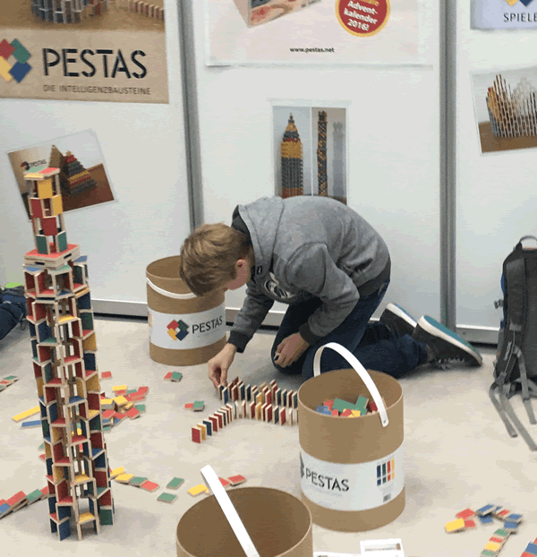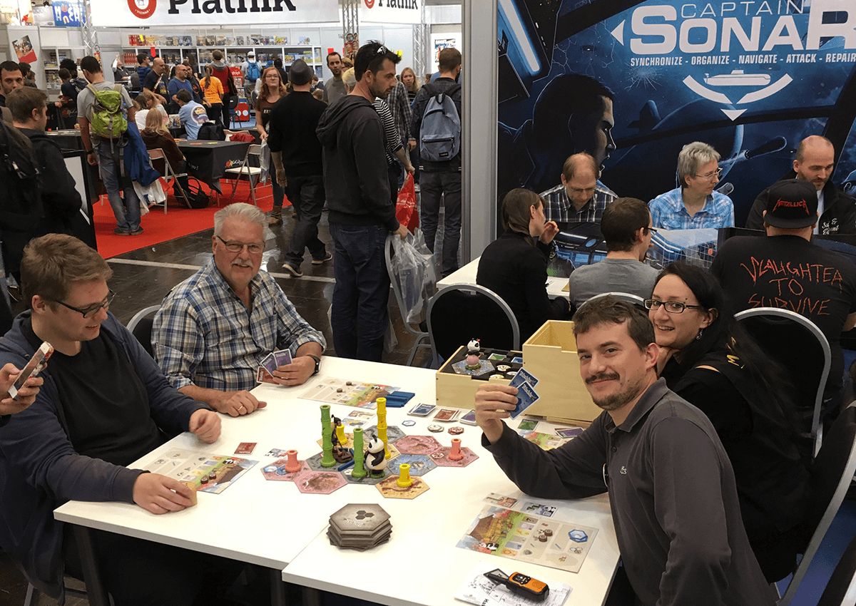 チケット(1日券 €13=約1500円, 4日券 €31=約3500円) を見せて会場に入ると、そこには視界いっぱいにゲームの海が広がります。何カ国もの言語が飛び交い、道行くあらゆるところでボードゲームが試遊されていました。