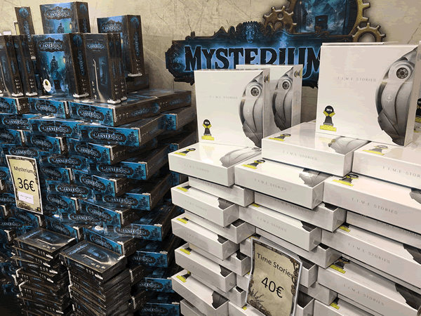 会場をつなぐ通路にも円座になって巨大なボードゲームが至る所で展開され、老若男女国籍人種の垣根を超えて多くの人々が笑顔でコマを抱えて遊び興じている様子は、SPIELならではの光景でしょう。壁際には身長の倍ほどまで積まれたボードゲームを叩き売りしているブースがいくつもあり、日本ではプレミア価格が付いてしまったり、絶版で手に入らないゲームさえも売られていました。その価格もおおよそ日本での半額ほど。誰もが足を止めて買いこんでしまうのも頷けます。筆者は控えめに20個ほど買ってきました。買いすぎですか? でも特価で売られているボードゲームの山を見たら、ついついレジに並んでしまうんですよね……