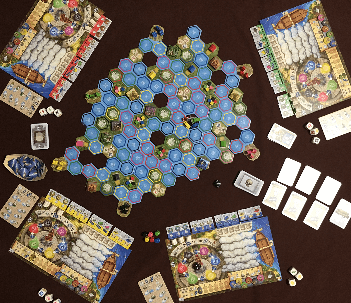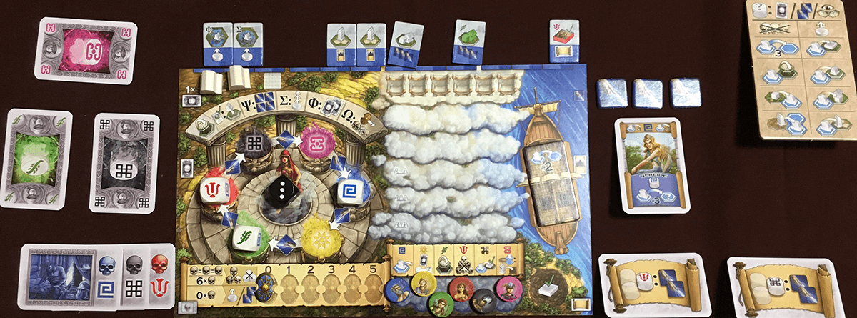 ゲームをセットアップすると、数多くのカラフルな木製トークンがまず目を引きます。エーゲ海の広大さが伝わるゲームボードは、旅立つプレイヤーの心を躍らせること間違いなし。個人ボードも神話世界の雰囲気をかもしつつコンパクトな構成になっていて、初めてでも遊びやすいゲームという印象を受けます。各自3つずつ配られるダイスのアイコンも雰囲気に合わせたデザインです。