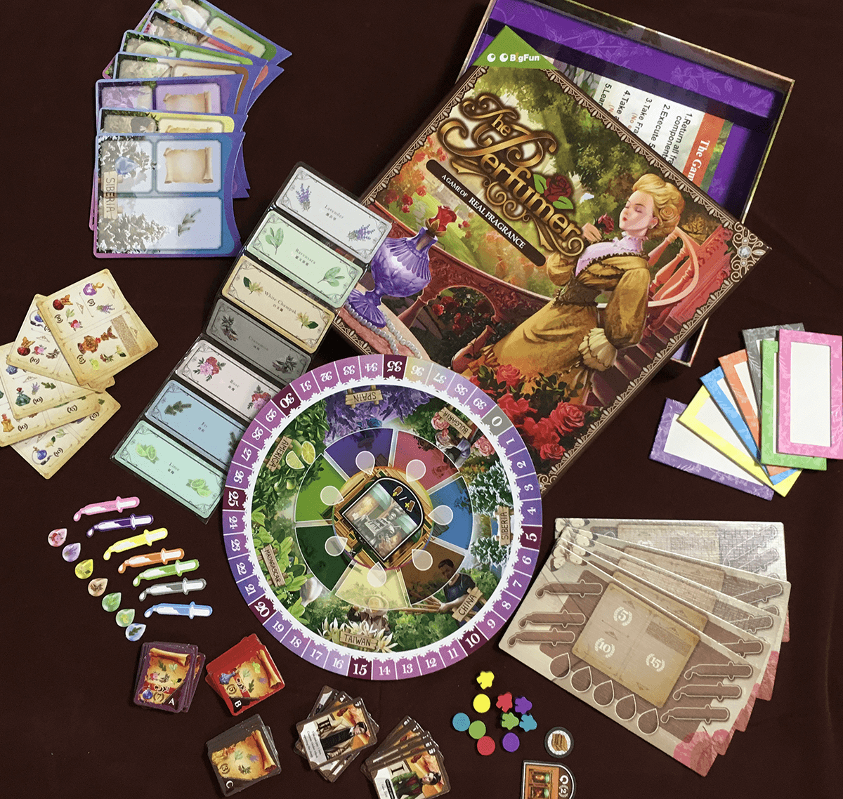 このデザインの美しさとコンポーネントの華やかさは、ぜひ実物をその目で見ていただきたいほど絶品です。カードの裏面をこすると香りが立つように特殊な印刷がされていて、香りは2年以上持つとマニュアルに記載されています。香りのカードはスペアを含めて3枚ずつ封入されているので、長く楽しめそうです。