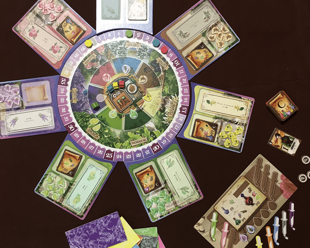 プレイ中の様子も、見てくださいこの絢爛さ!中央に配置されたマップボードが実に華やかですよね。マップを囲むように7つの香りカードが花びら状に配置されて、彩りを与えてくれます。