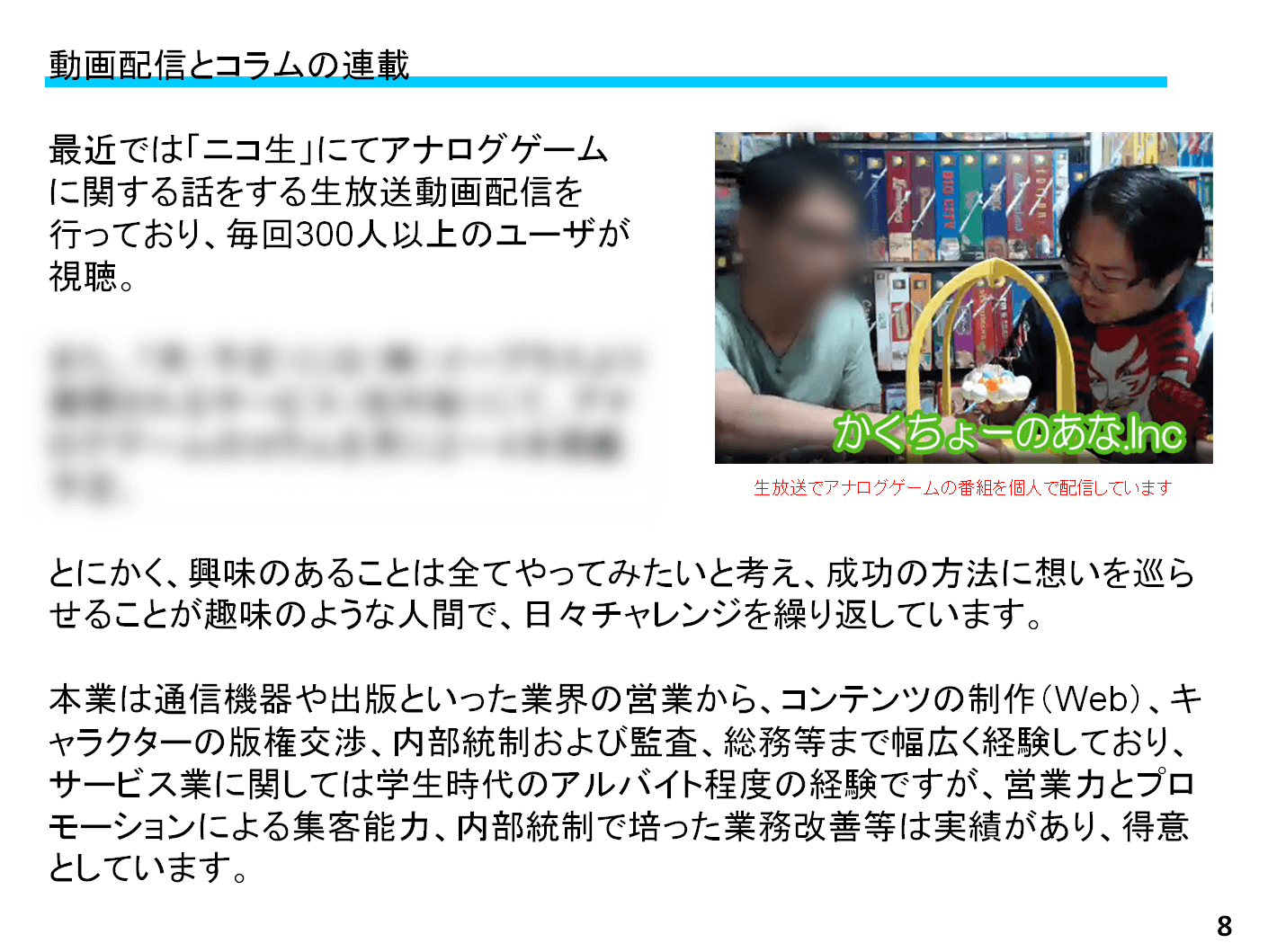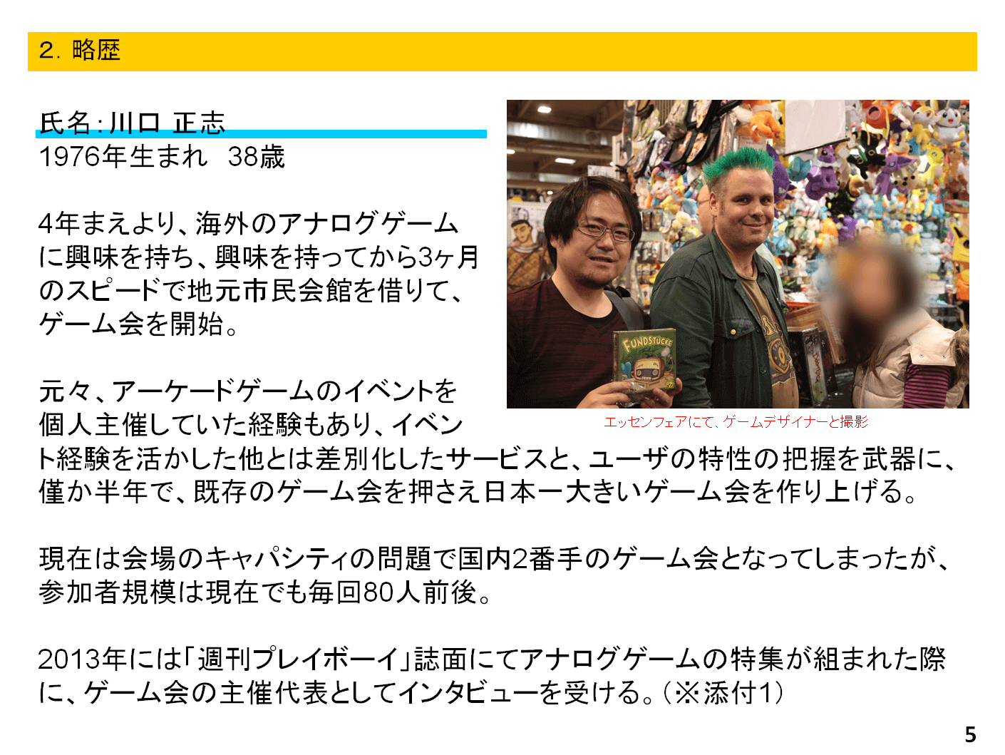 自分の世代よりもっと新しい世代と自分より更に上の世代にはちょっとした壁があって、今、上の世代の方の中には最近この業界に入った方を警戒している方もいるかと思います。「最近の参入者はボードゲームに思い入れがあるわけではなく、ブームだと思って乗っかって、業界を悪い方向へ持っていくんじゃないか」と心配しているようです。自分もどういう方がやっているのかわからない、顔の見えない団体については警戒してしまいます。故に、顔が見える、知られていることはある程度必要だと思っています。