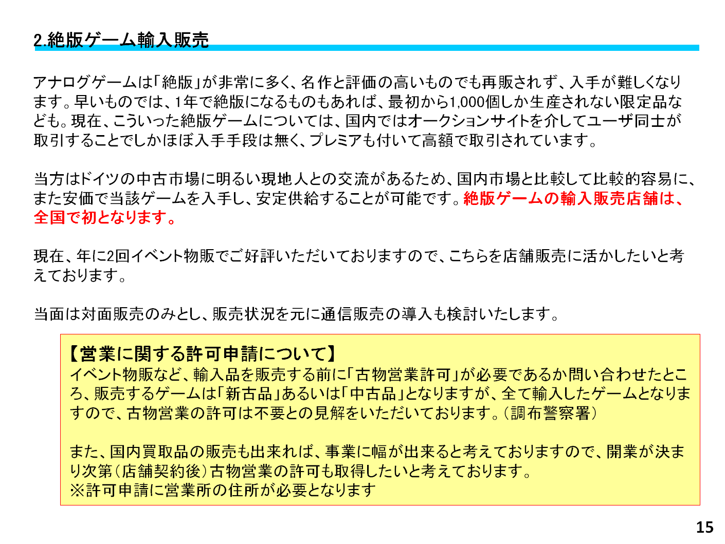 新品の小売も中古もディストリビューター(卸売)も、広くやりたいと思い事業を計画し始めました。過去3回ゲームマーケットで中古販売を行い、予想を上回る結果を得ることができました。しかしそれだけで食べて行こうとすると、毎月それ以上の売上を達成しないといけない計算になってしまって、難しいなと。