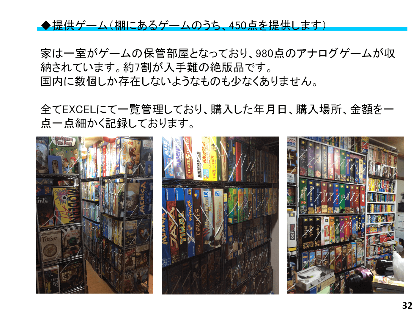 ご自宅の写真、ボードゲームが大量にありますね。