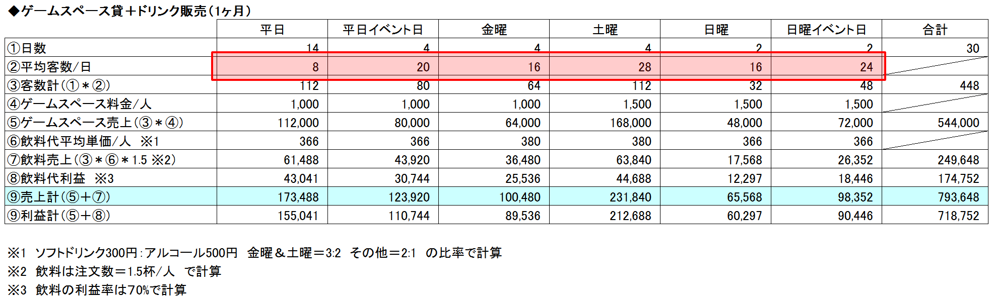 ゲームスペース貸+ドリンク販売の②平均客数/日について、実際はこれ以上いつもいらっしゃる印象ですが、計画と実績の乖離はありますか?