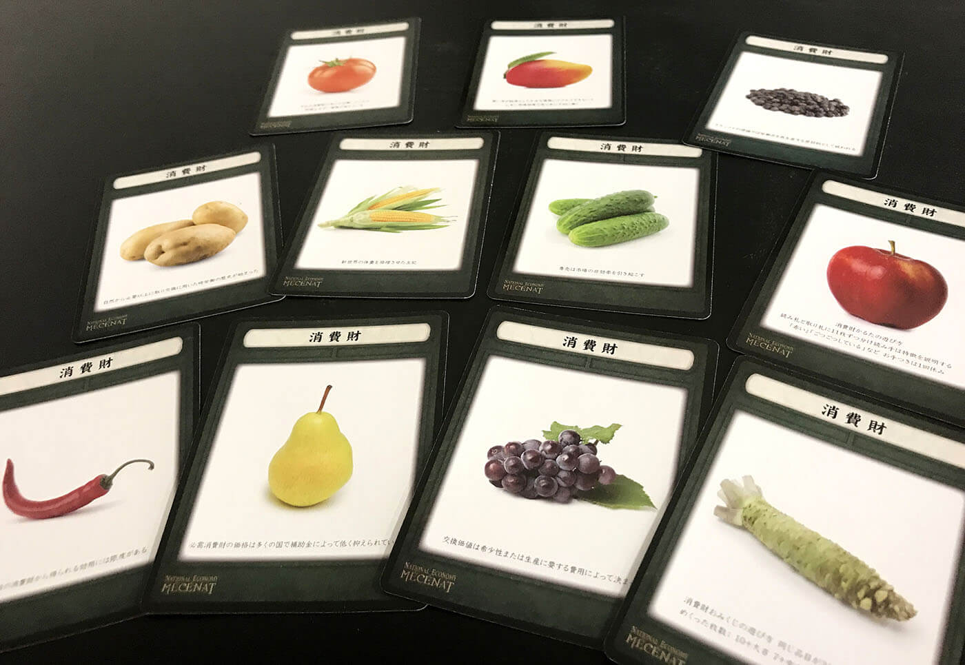 シンプルなルールながらも徐々に賃金が高くなる労働者や、「家計」という賃金が支払われるごとに増える共通のお金の場に特徴があります。1時間弱で終わる中量級ながらも、戦略に幅があり、引く手札によって柔軟な対応が求められます。消費財カードには果物の写真とそれぞれ異なるコメントがあり、固く感じられるテーマの中にも愛着が持てるゲームになっています。