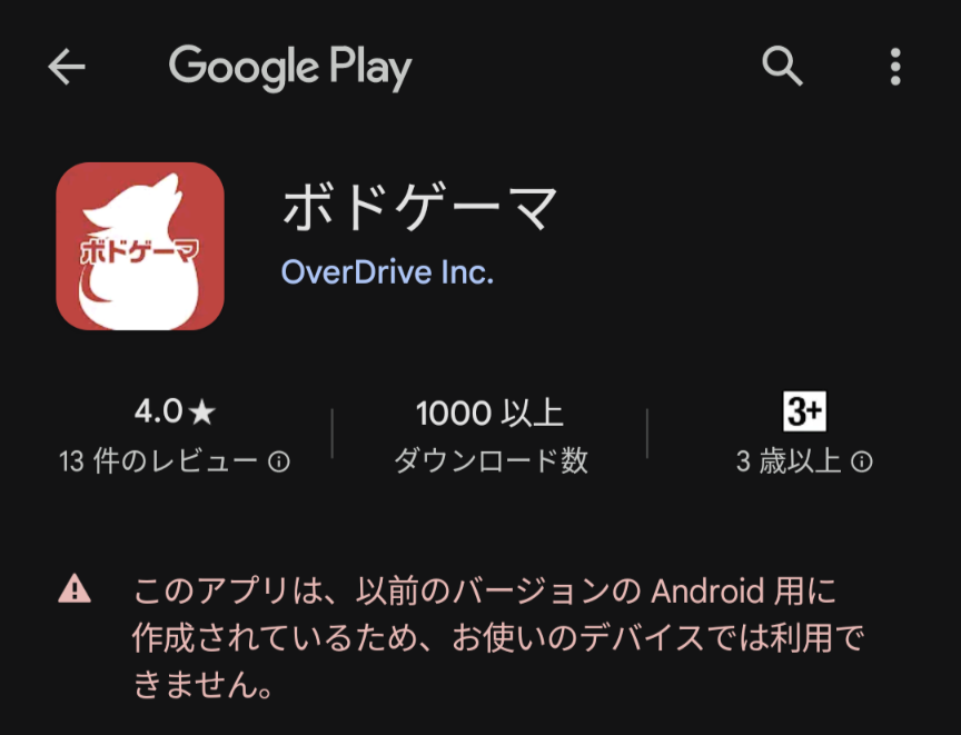 Android版のボドゲーマアプリがインストール要件を満たさないため、ご対応いただけないでしょうか。