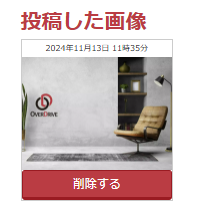 画像を投稿したアカウントにログインしてると、以下のように投稿した画像と、画像の下に「削除する」ボタンが表示されます。