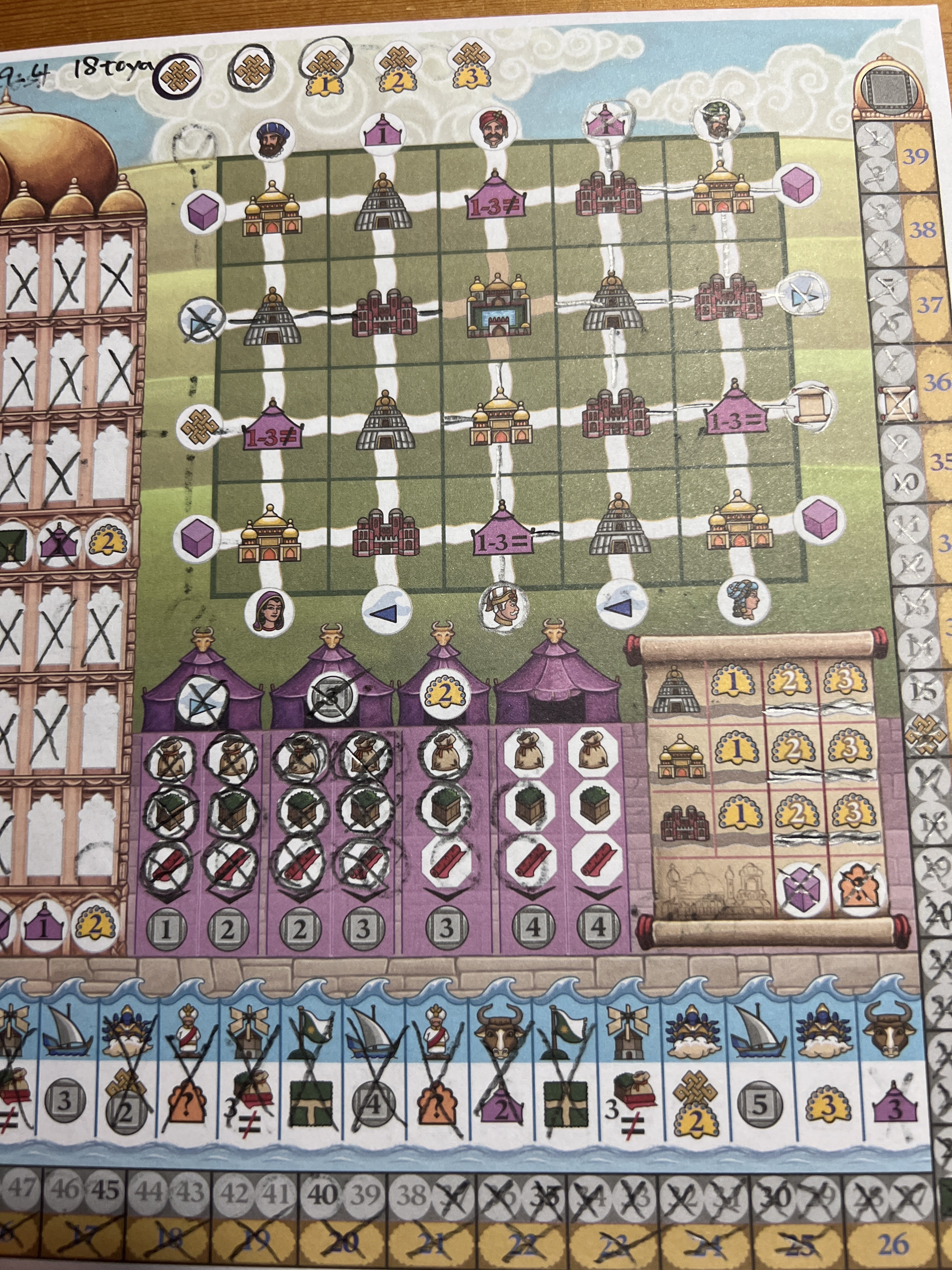 ここで一つ多人数専用紙ペンではありますが面白い紙ペンとして挙げずにはいられない作品を。「ガンジスの藩王」本家同様お金と勝利点が反対方向から伸びていきいち早くクロスさせた人が勝利!要素としては領地・宮廷・商品・川下りと本家と同じ要素で、プレイ感としてはダイス確保まで必要な本家よりはライトに遊べながらも雰囲気の再現には成功しています。