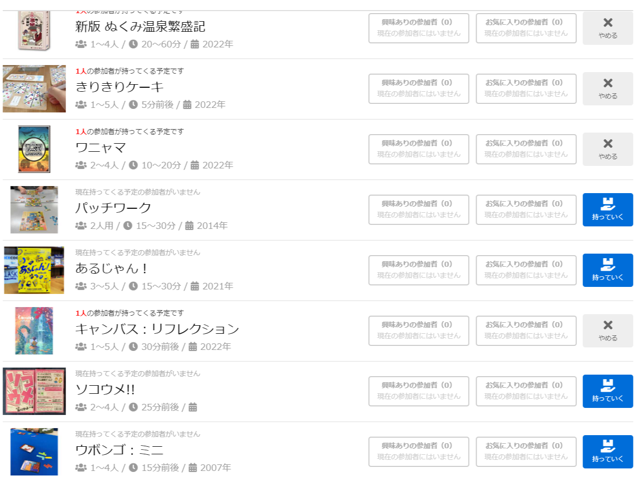 このボドゲ登録機能ですが、持っていくボドゲをクリックで登録できるのは便利でございます。