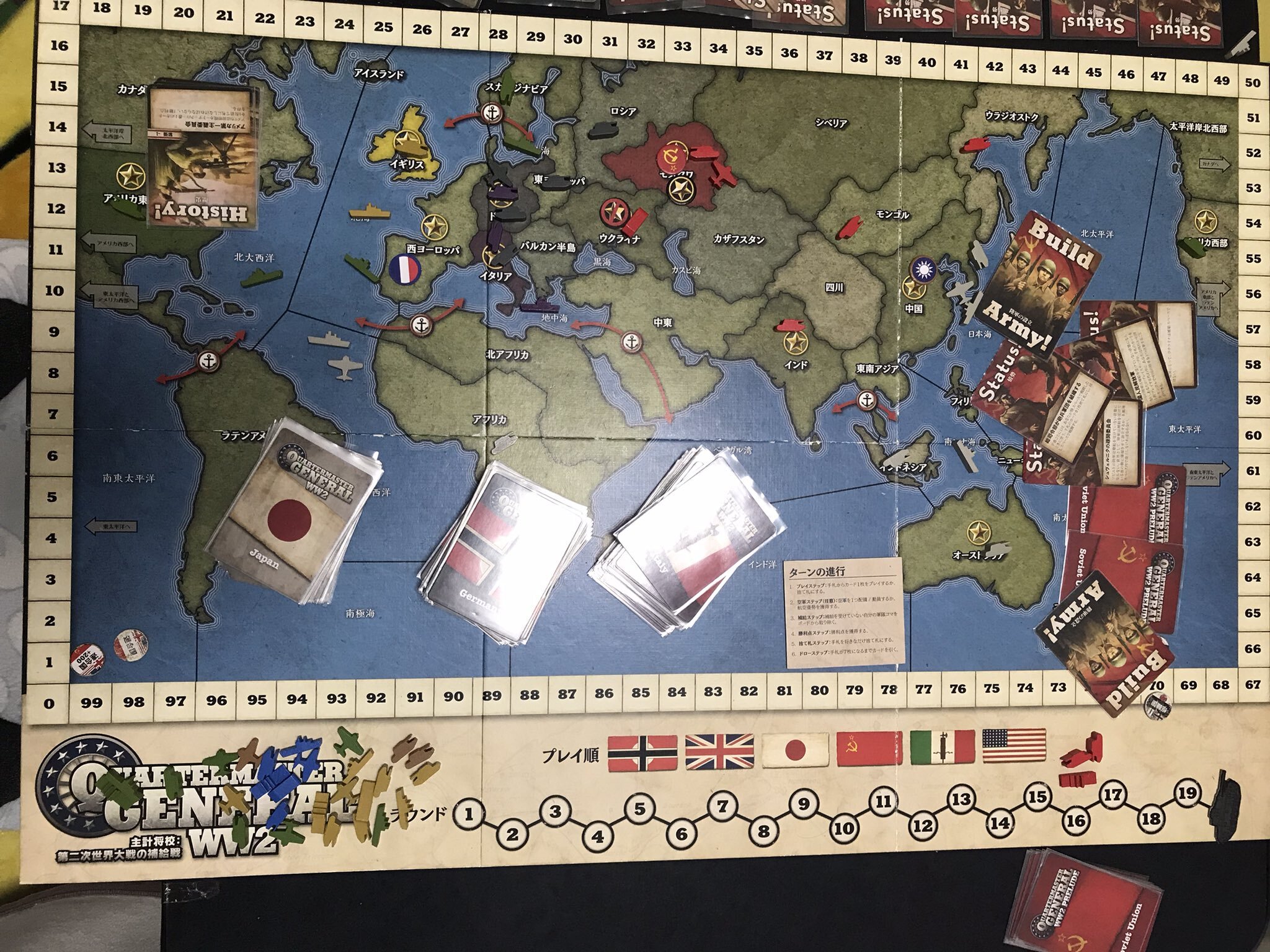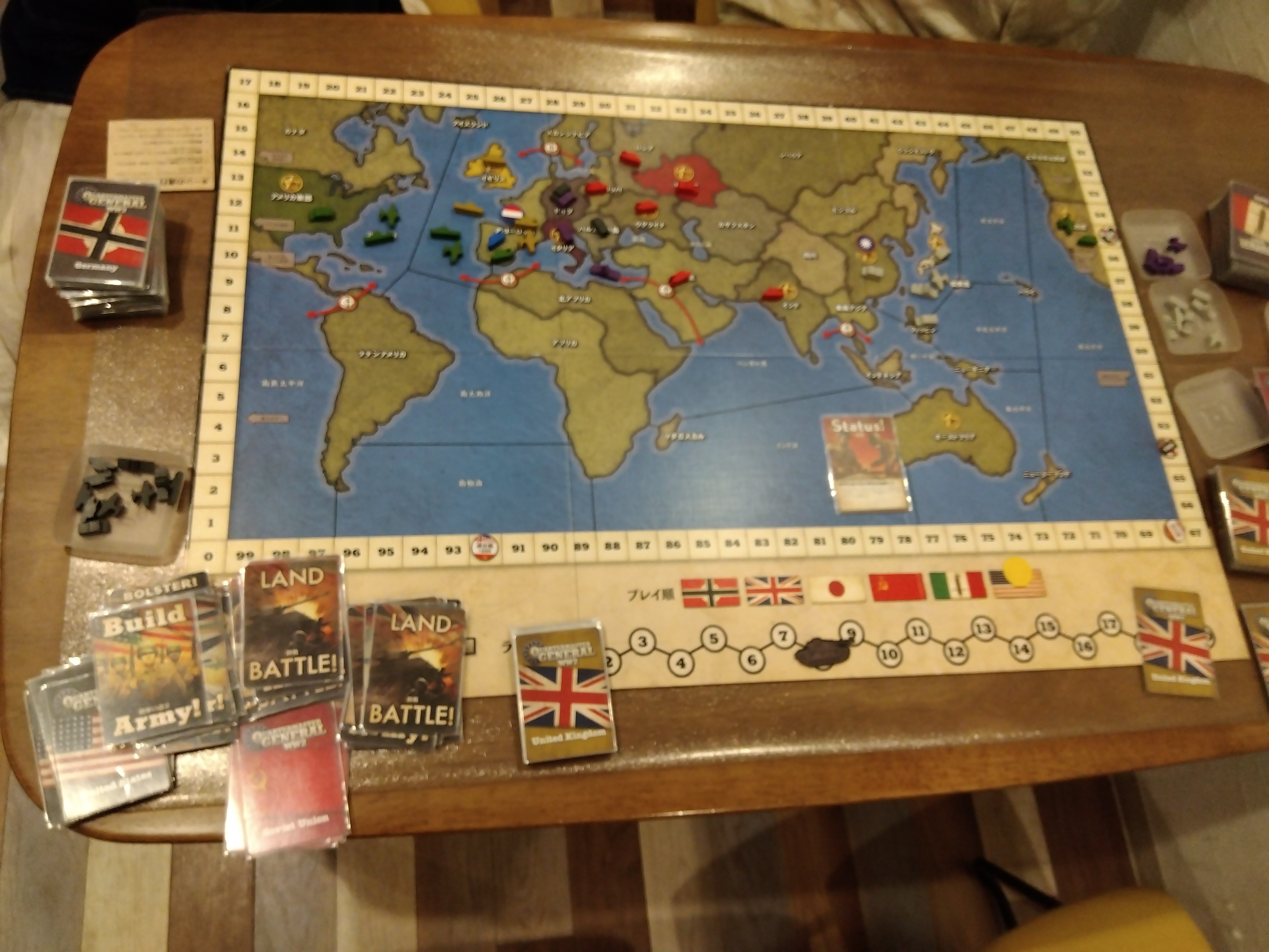 3戦しましたがやはり連合が強いですな。特にBRESPIにてお聞きした解釈。東ヨーロッパに陸軍を召集出来て。単独でいても補給がある状態になる。以前の解釈では補給スペースに繋がっていないので東ヨーロッパの側には設立出来ない。との解釈でしたが。補給スペースになら設立できると解釈するそうです。ですので東ヨーロッパからはドイツとウクライナに設立はできるってことになります。つまりイギリスはポーランドの主権だしてそこに陸軍がいればドイツが枢軸軍がいなければ陸軍設立出来るし。ウクライナに陸軍設立してソ連を手伝いつつ粘ったり中東、インドと繋げてもいいし。ウクライナ陸軍設立出来ればこのカードも使えるなど融通性が高まった。なので枢軸の攻撃はかなり必須になるので連合の勝率アップでしょう。ソ連の疎開委員会も同じ扱いになります。ですので召集系の多いソ連では脅威度がかなりアップしそうです。中国攻撃系は攻撃後に空いた中国に設立すればいい。チトーはイタリアとドイツ攻撃し放題。そのあとどちらかに設立すればいい。境界友好条約も攻撃してもよし。ドイツかウクライナ、モスクワに設立出来るし、前哨戦で四川にだけソ連陸軍がいてカザフスタンが陸軍いなくても1ターン目に疎開委員会出せば中国かインドに設立目指せば良いといいことが多くなります。なので枢軸はかなり即対応しないといけないのでかなり連合に有利になるのはどうしたらいいかわからない・・