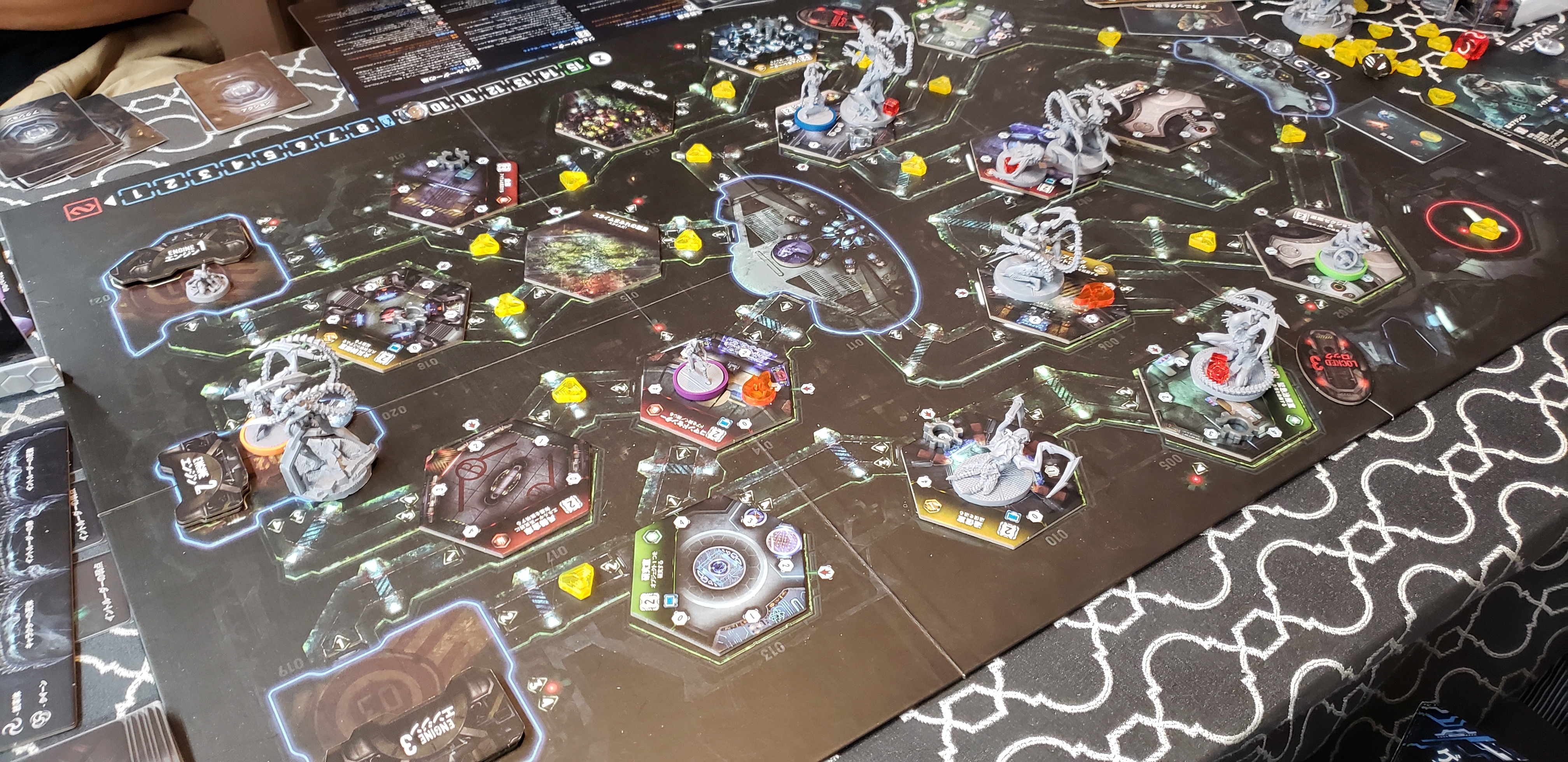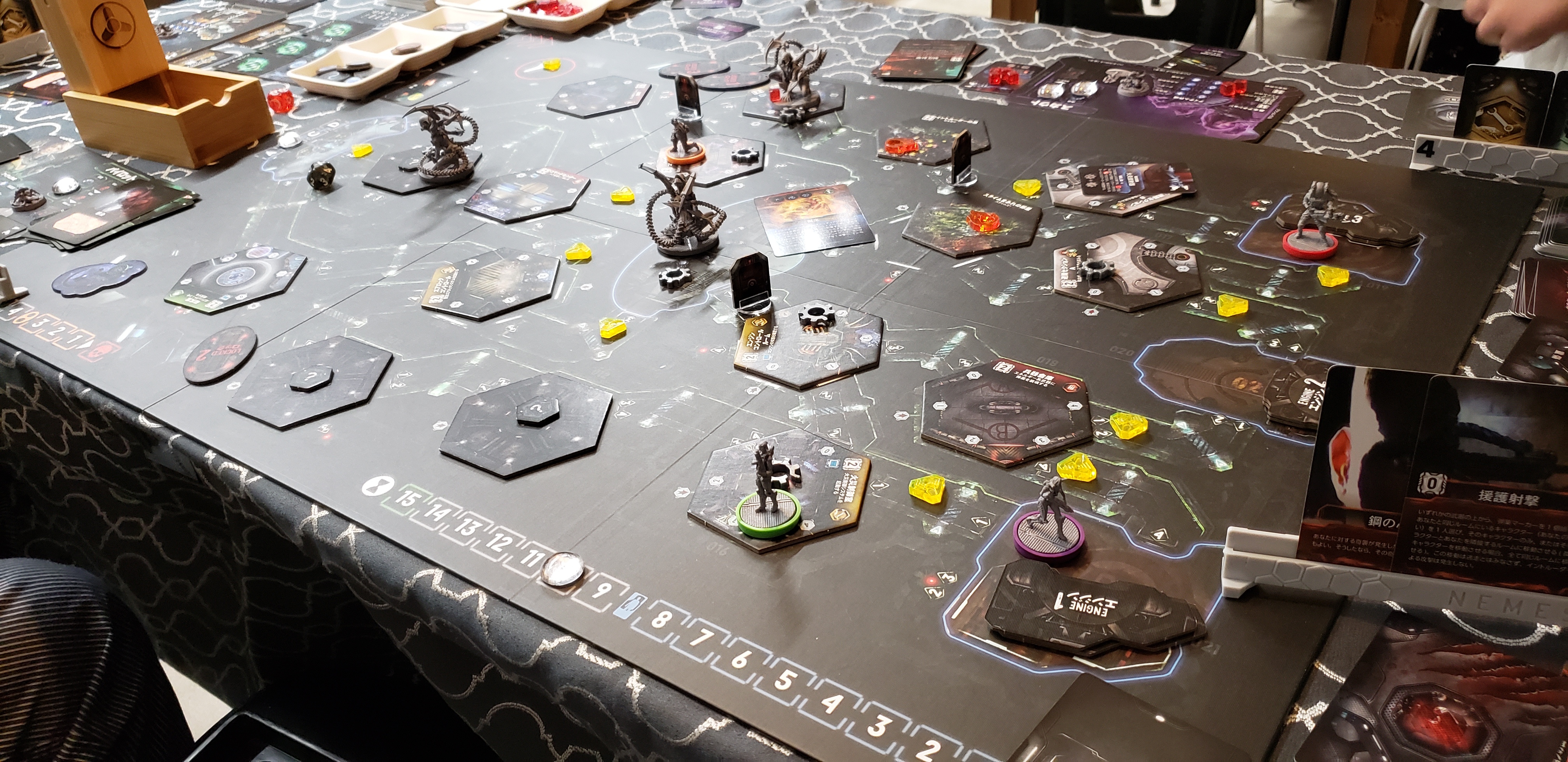 ネメシス:通常ルール4人プレイ、みやじまさんが脱出直前で不運に見まわれ死亡、KRさんが目的を果たし地球に到達も最後の感染チェックで死亡、惜しい!