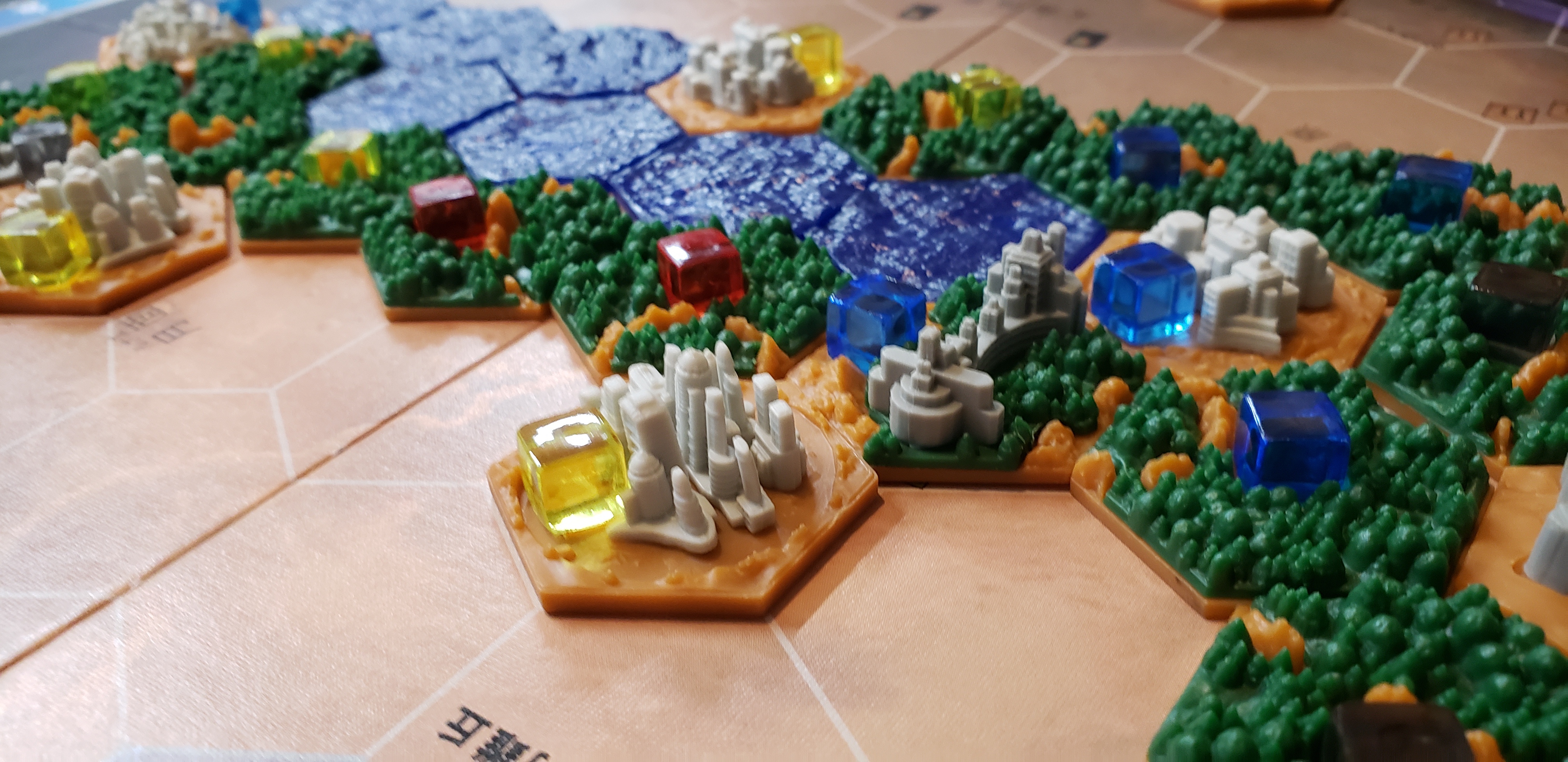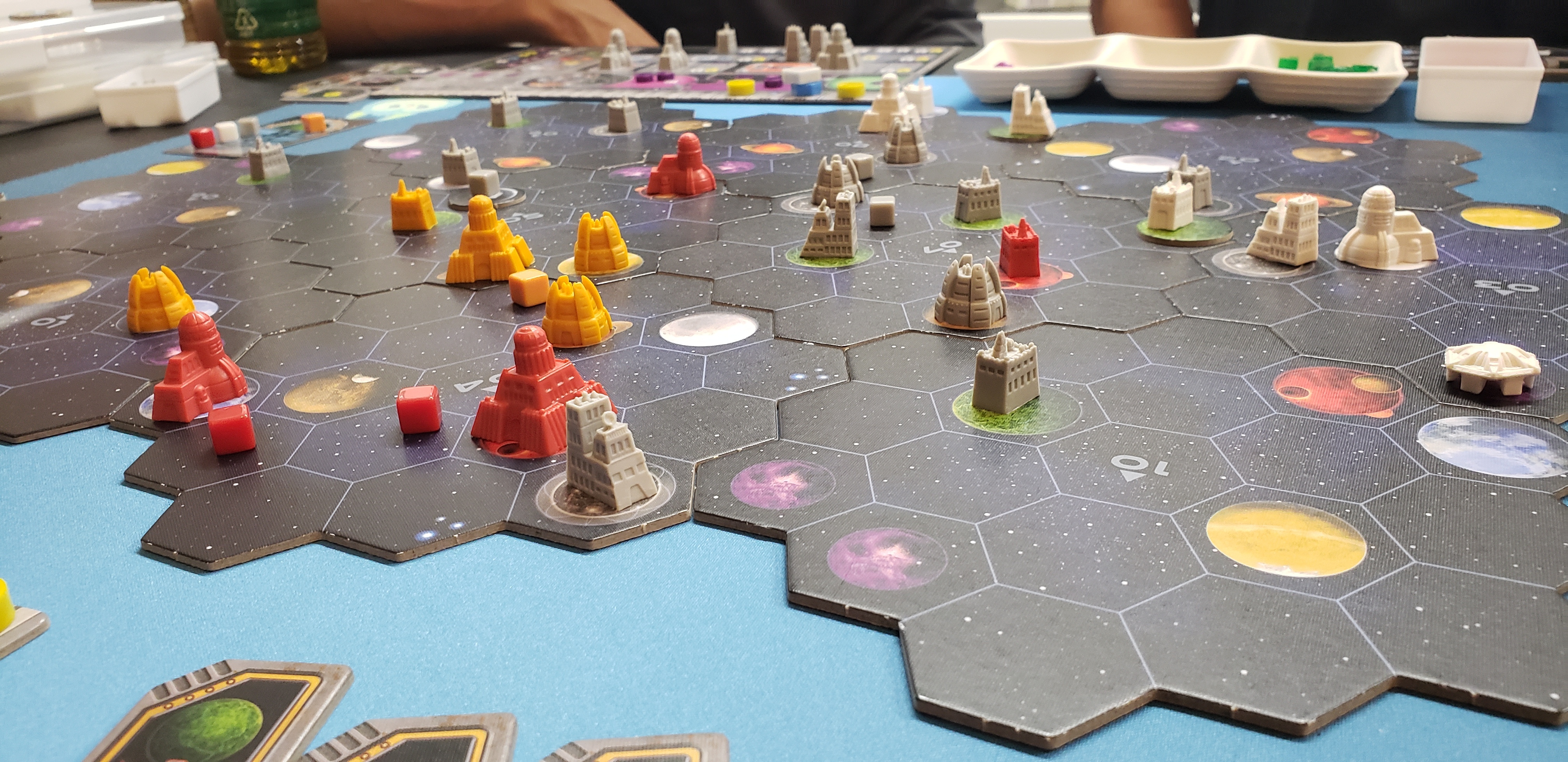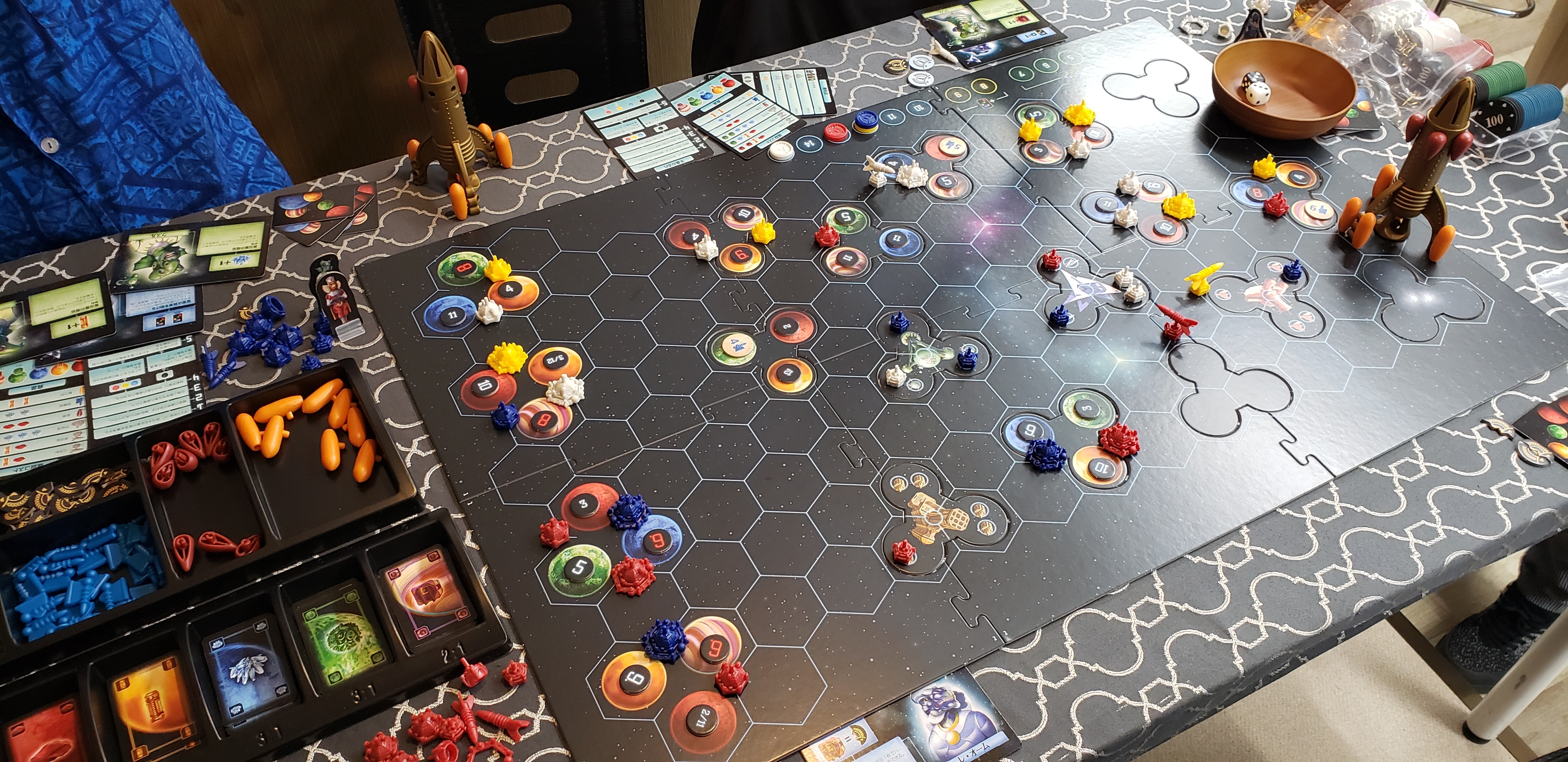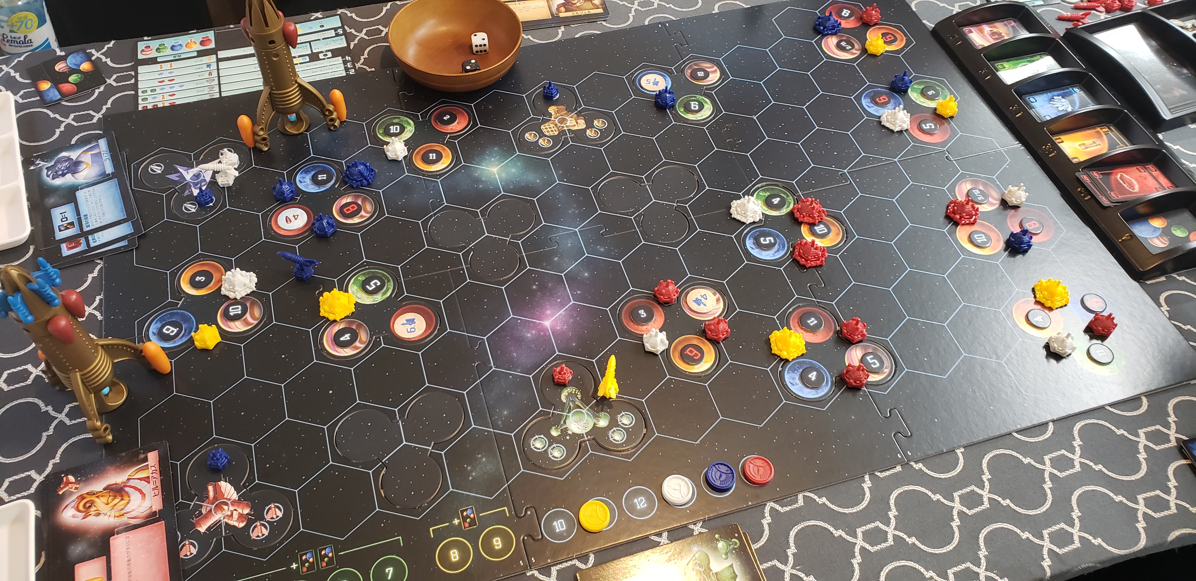 宇宙カタン:同卓の常連さんが押し切り勝ち 探索バリアントでタイル配置しましたが、資源惑星の偏りがすごかった…