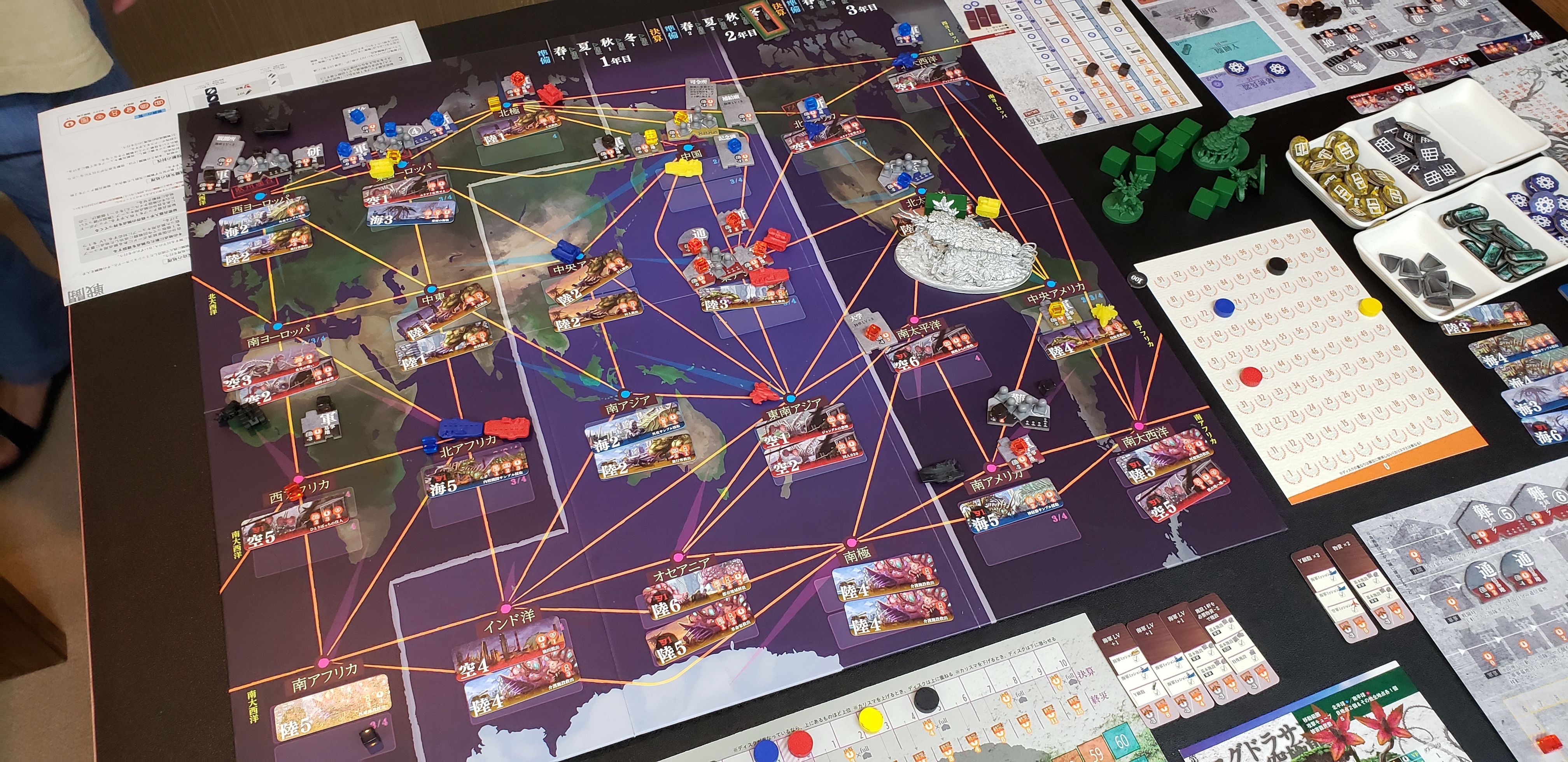 パンデミック:10周年記念版で豪華にプレイ!次でワクチン作ってクリアだねと言ってたら、最後のドローでエピデミックからのアウトブレイク3連鎖で失敗…