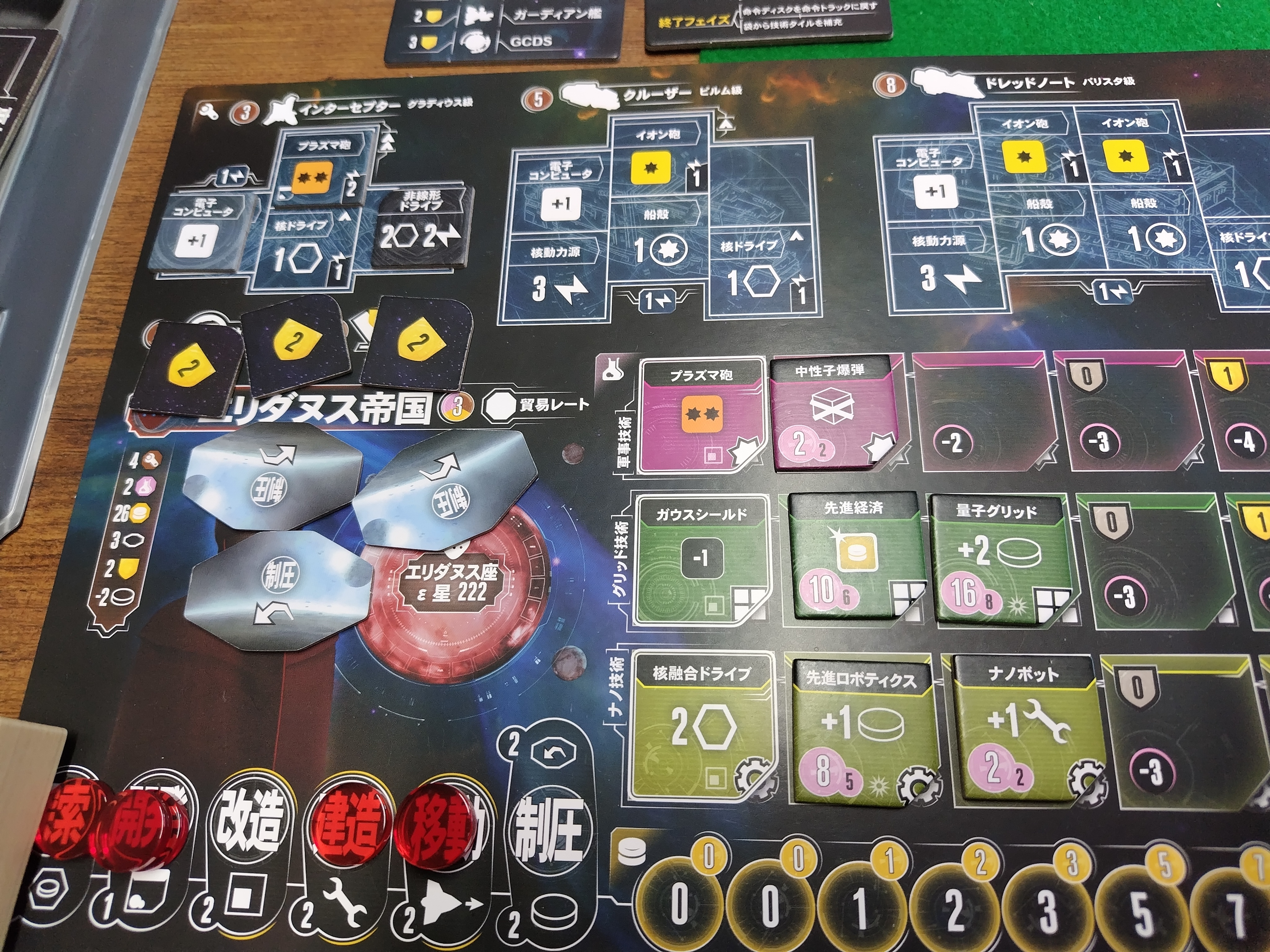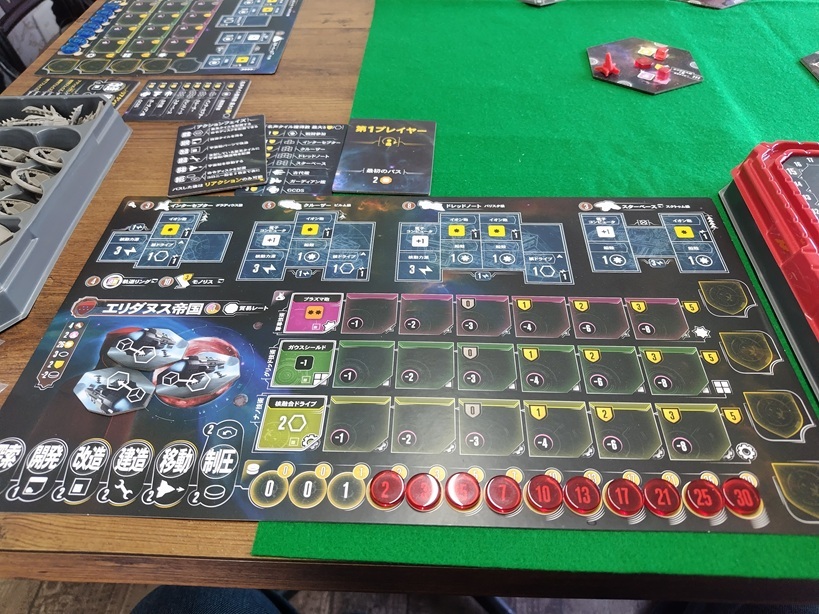 開始時点の盤面とプレイヤーボード、私にっひーはエリダヌス帝国を選択、どのような戦いが待っているでしょうか…!