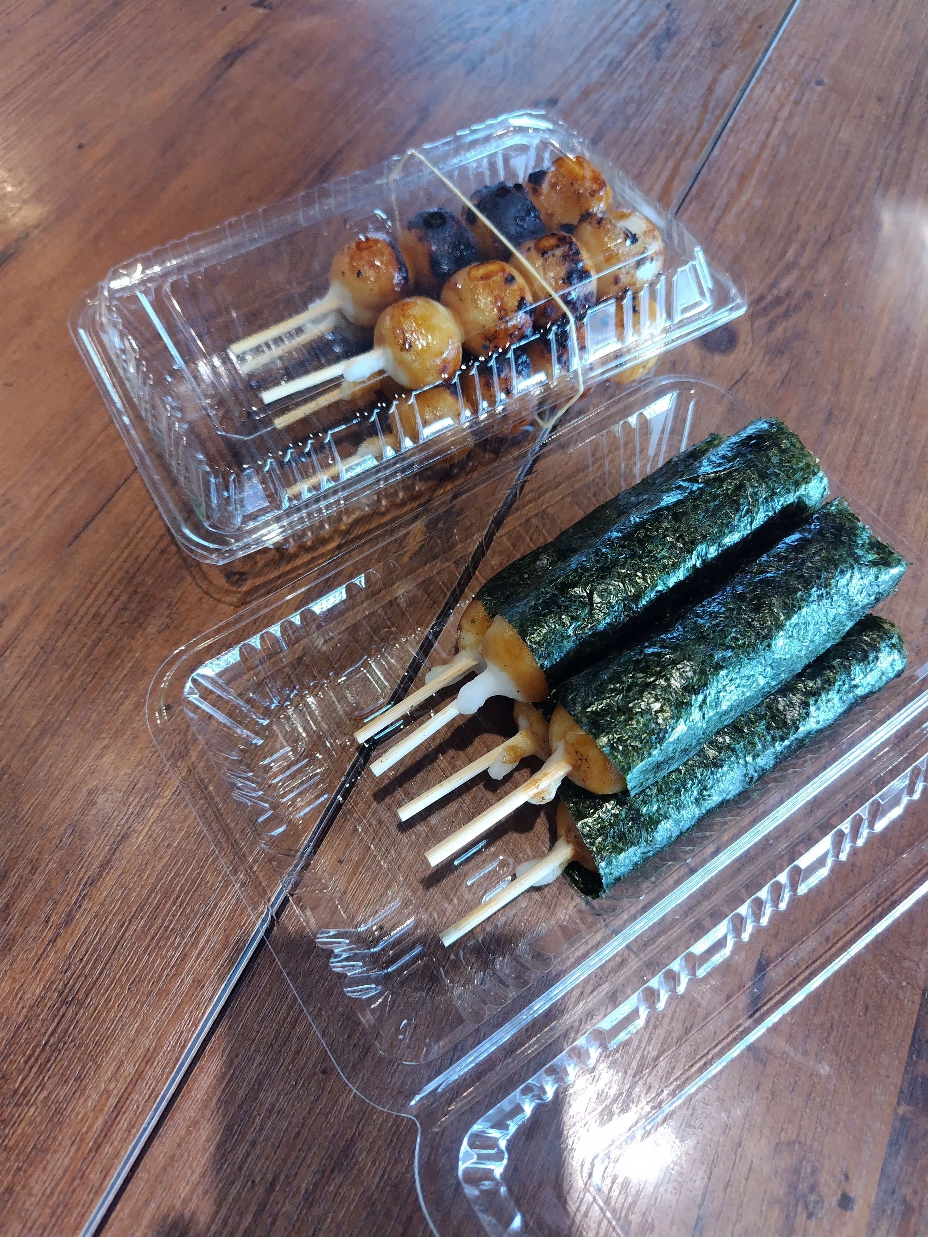 ボードゲームカフェローゼンブルクさまは、軽食を提供されていますが、持ち込みも可能となっております。これは同じ建物で営業されている「甘味茶房かすが」さまの持ち帰りの団子です。もちもちで香ばしい王道のお団子、とてもうまい!