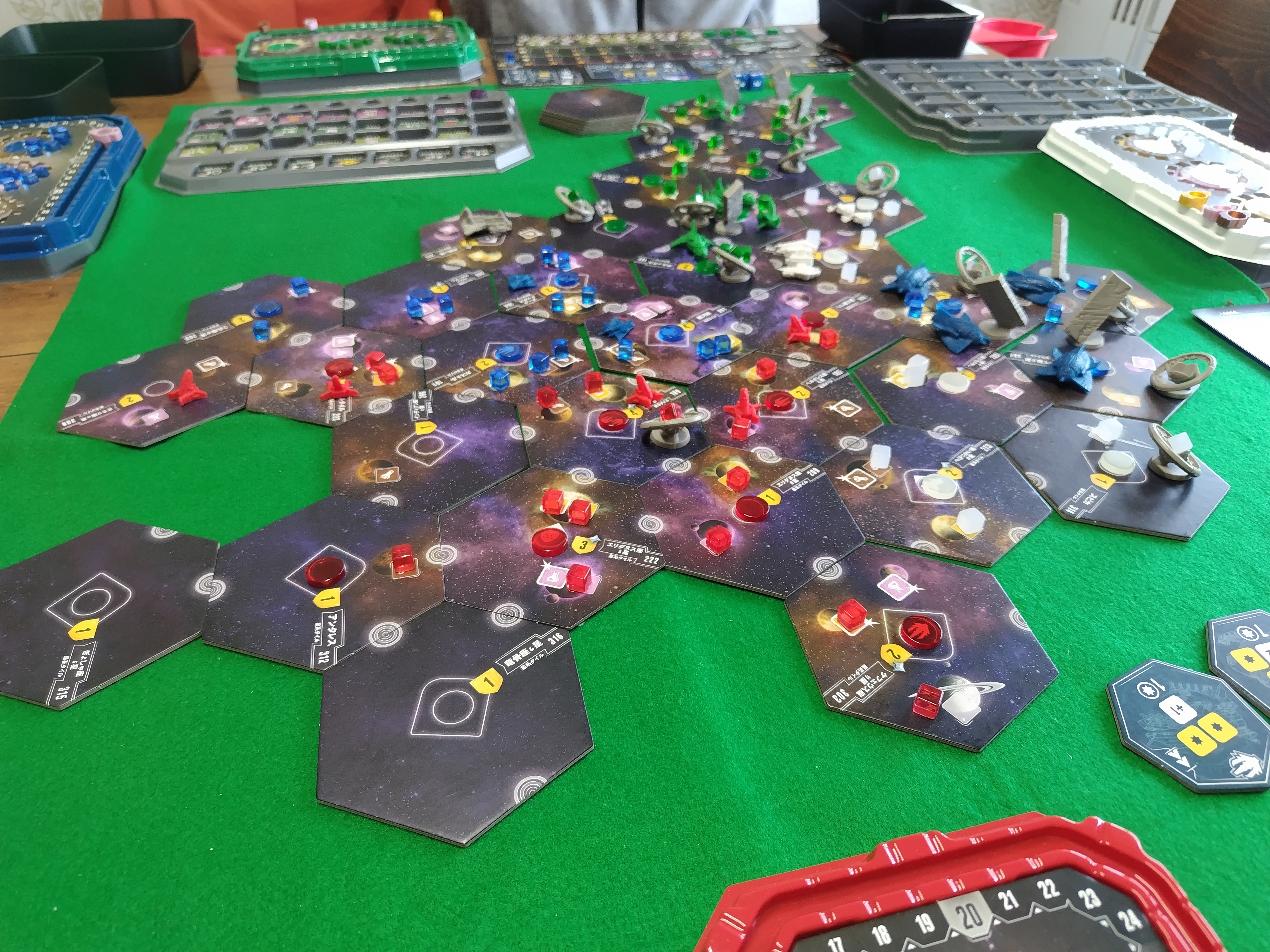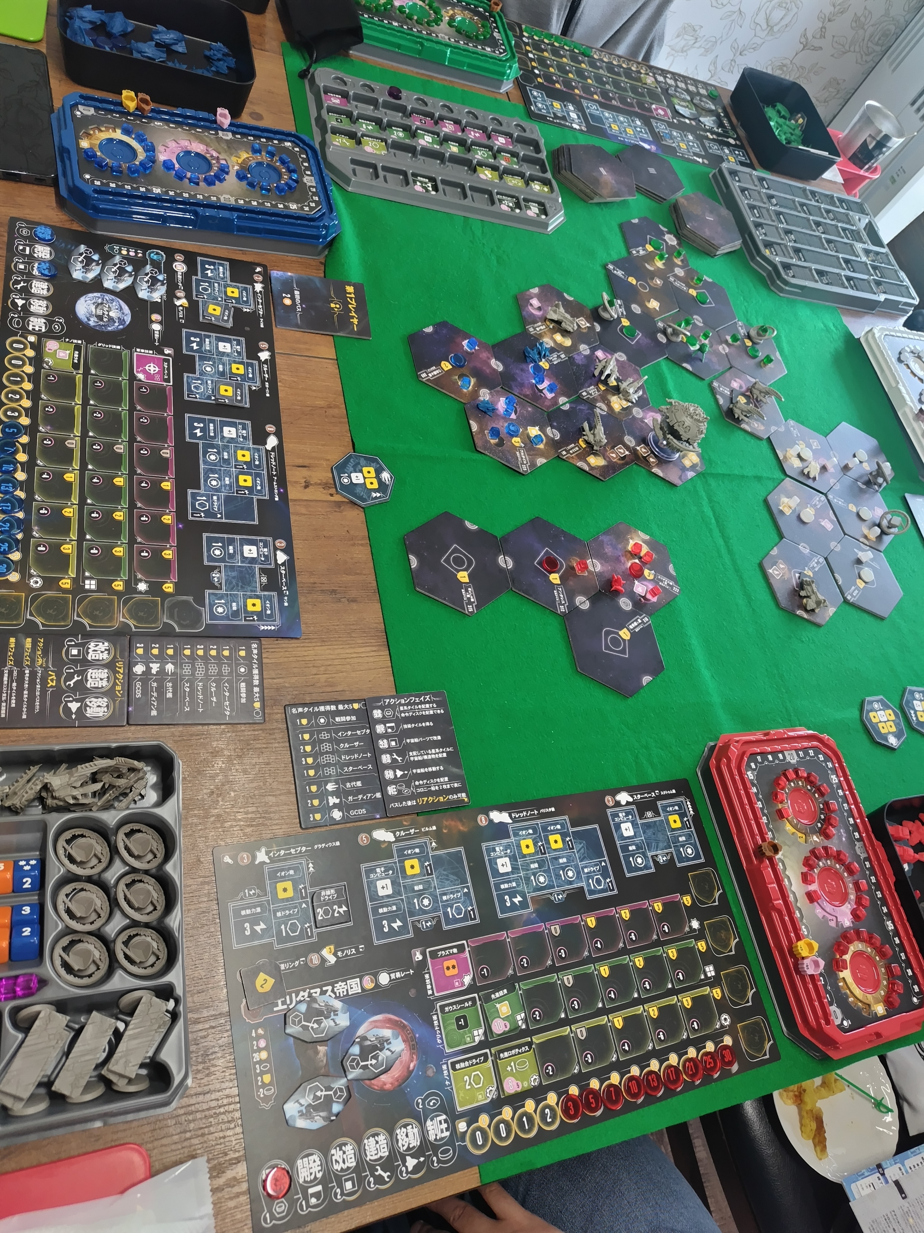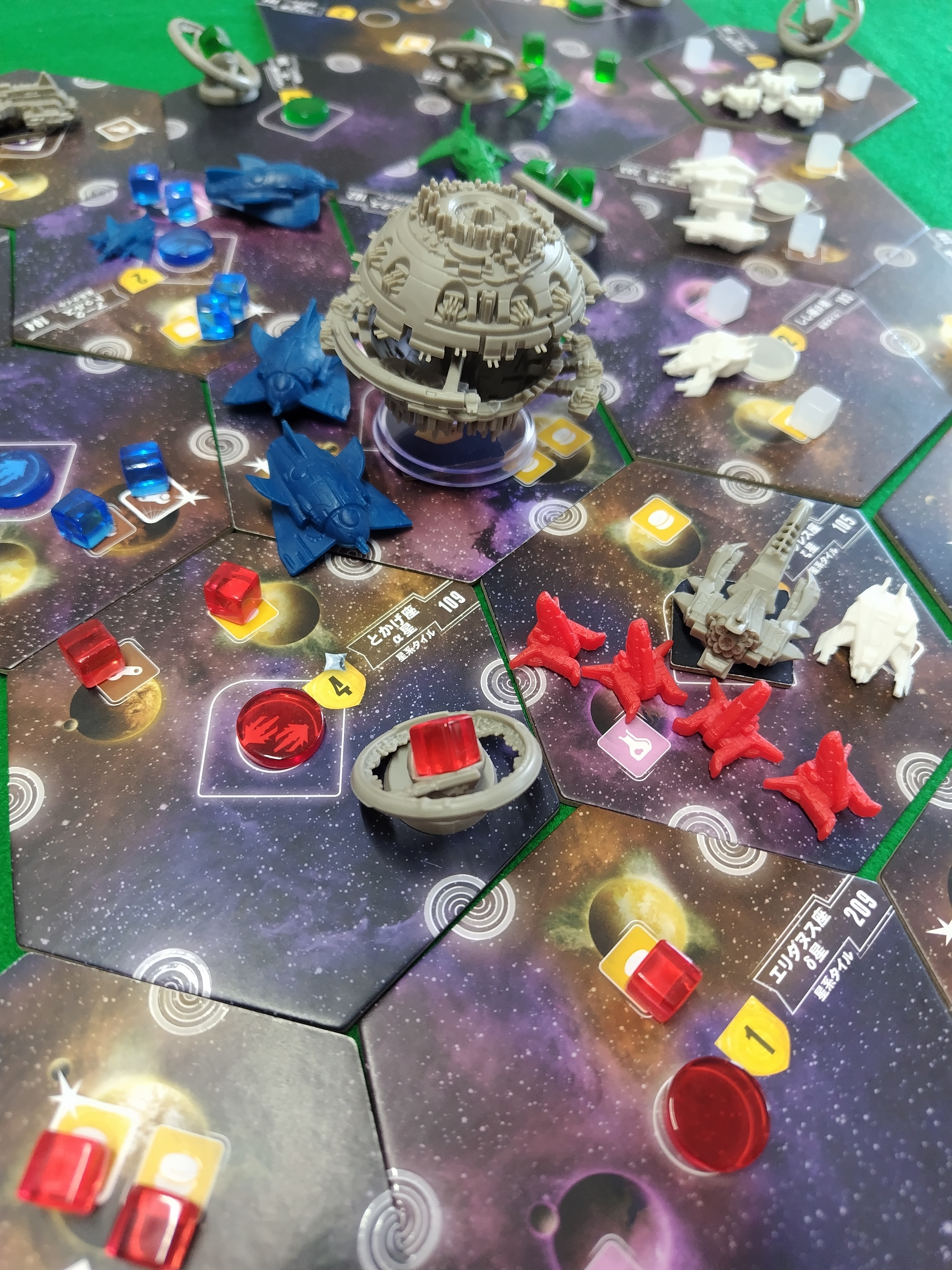 プレイしたゲームは「エクリプス~新たなる銀河の夜明け~日本語版」(投稿者にっひーの持ち込み)、インストに2時間・プレイ時間は4人で3時間半ほど、何回目かのプレイになるメンバーが居て想定よりは短かったですが、やはり重ゲーですね…!
