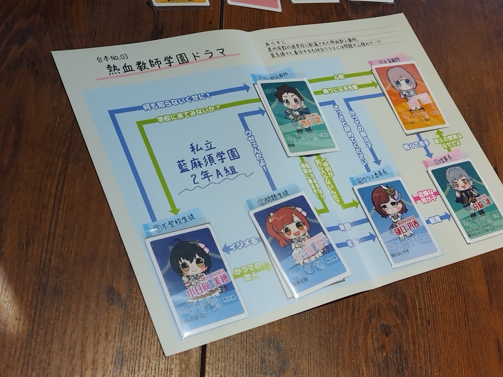 さて今回大ブレイクした「CAST M@STER MEETING!!!!!!」です。写真は完成形ですが、最初はすべての役柄が空の状態から開始し、ランダムな順番で配役を1人ずつ決めていく、決め方は、「このアイドルが良いという理由をプレゼンテーションすること」。全ブランドのアイドルへの理解度、役柄の特徴や関係性・配置済みアイドルとのシナジーを瞬時に読み解く瞬発力、それを審査員側のプレイヤーにいかにアピールするかの表現力…まさにプロデューサーとしての総合力が求められます…!