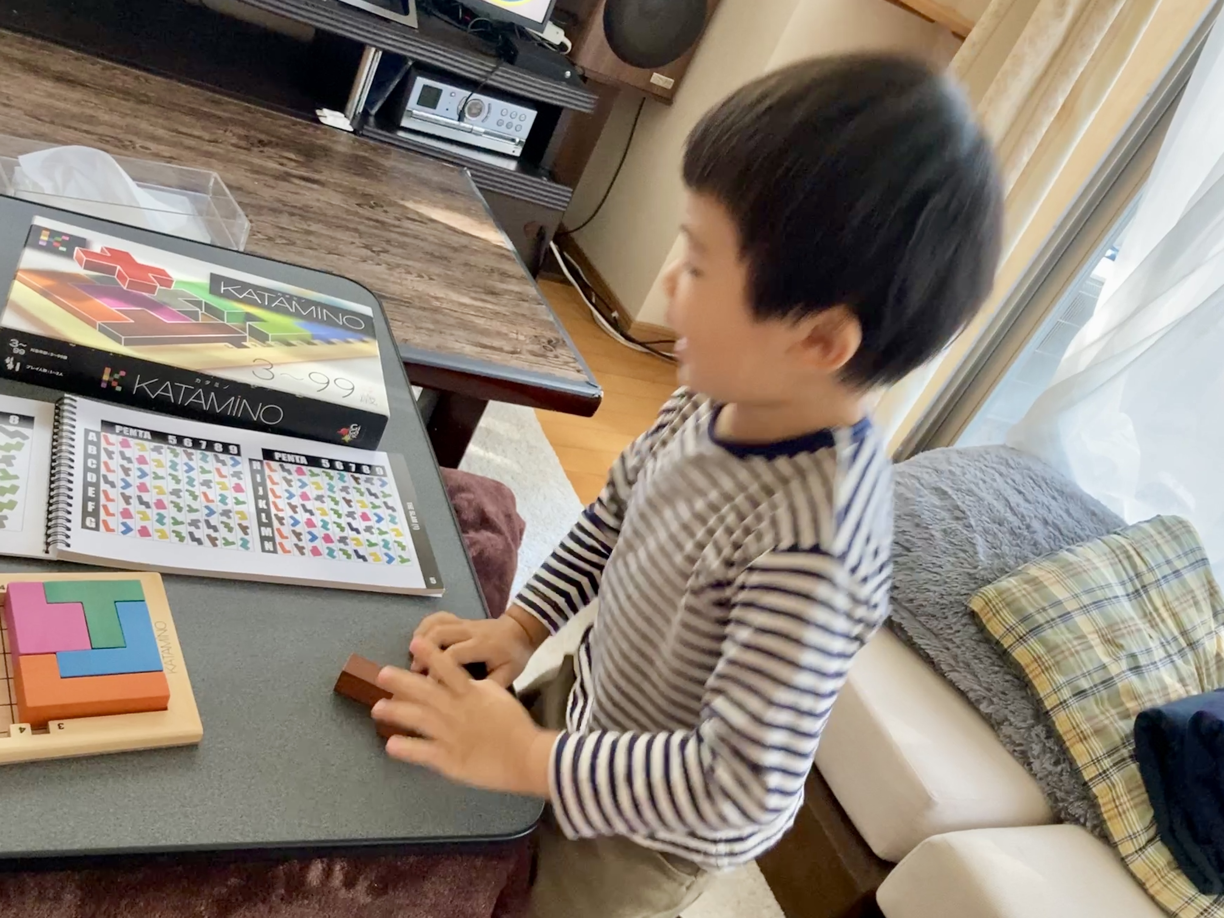 カタミノは枠の中に様々な形のブロックを収めるパズルですが、ひとつふたつ私ではめて最後のひとつをはめさせるというかたちで遊ばせていたところ、私がトイレに行っている隙に4ピースのパズルを単独で完成させておりまして約3歳児の知能をみくびっていたな、と我が子を見直した次第でした