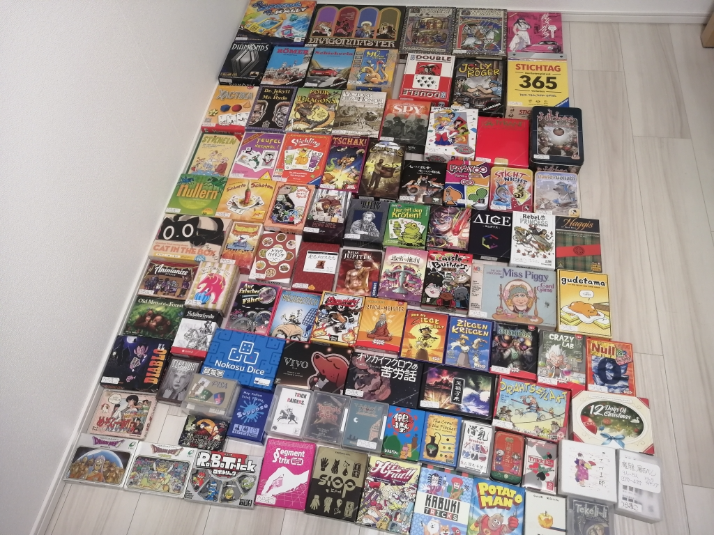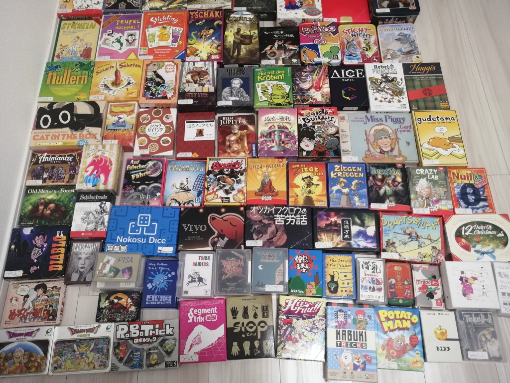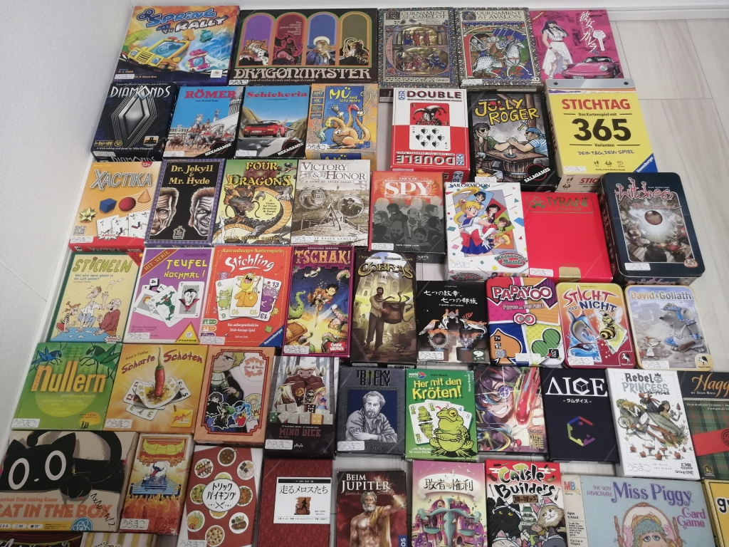 お店にありますトリックテイキングゲーム、うらまこ持ち込みのトリックテイキングゲームと合わせて100個前後ありますので、いろんなトリックテイキングゲームが楽しめるかと思います。