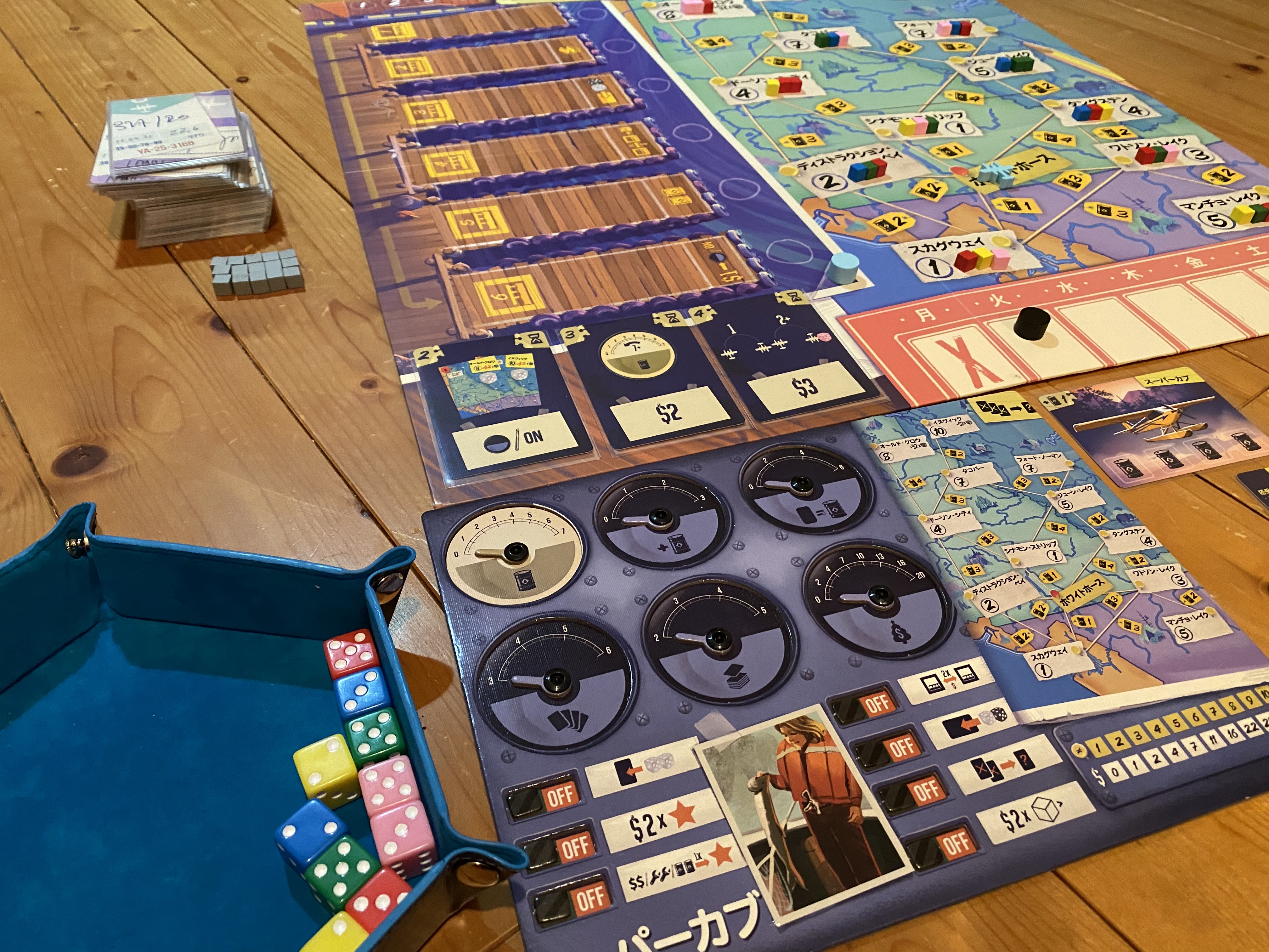 こちらはアラスカに実在した航空会社をモチーフにしたゲームです。ユーコン・エアウェイズ社の水上飛行機のパイロットになり、一週間の間色々な町に人を送り届けて勝利点(お金)を稼ぎましょう!という、いわゆるピック&デリバリーシステム。