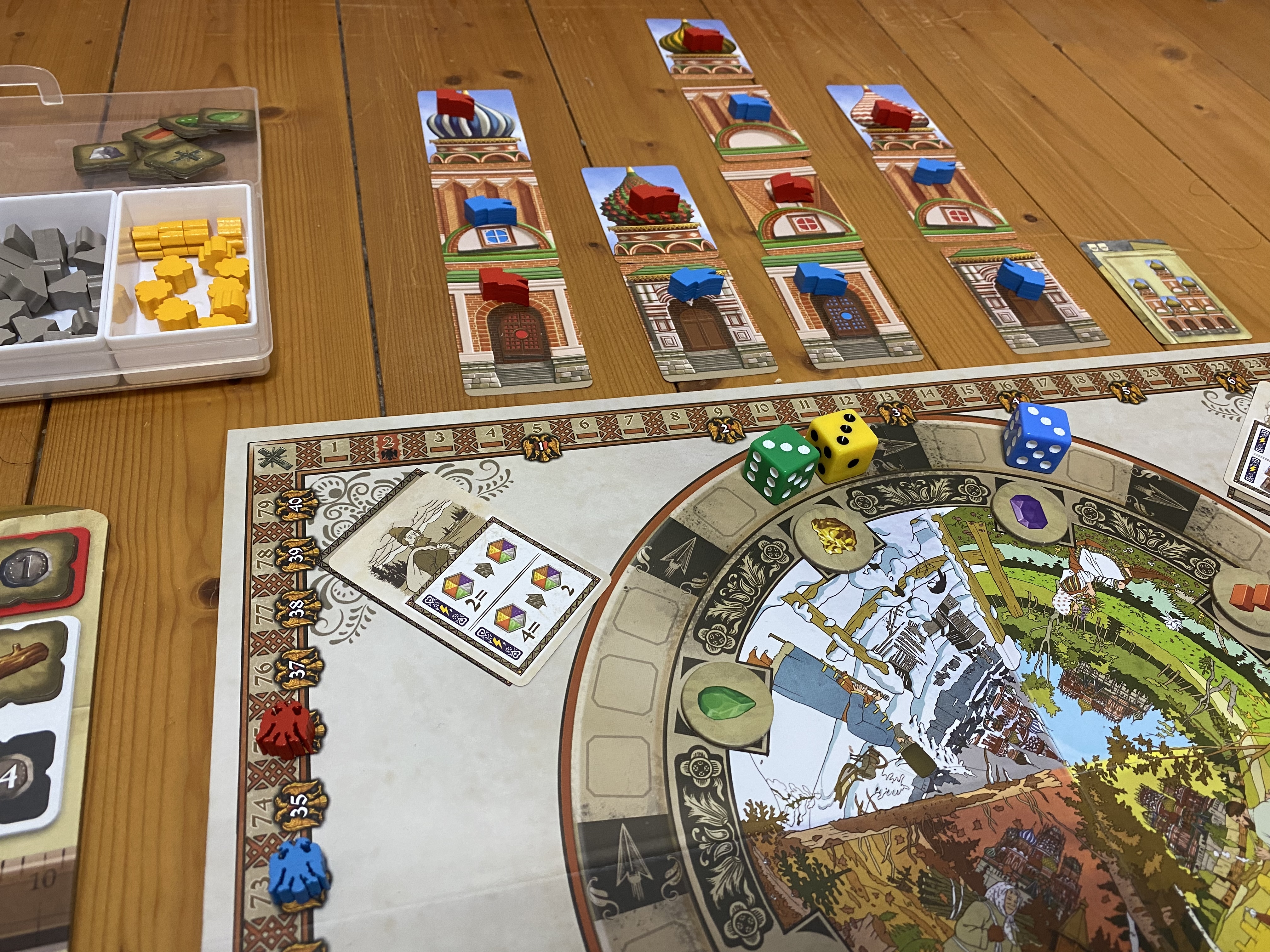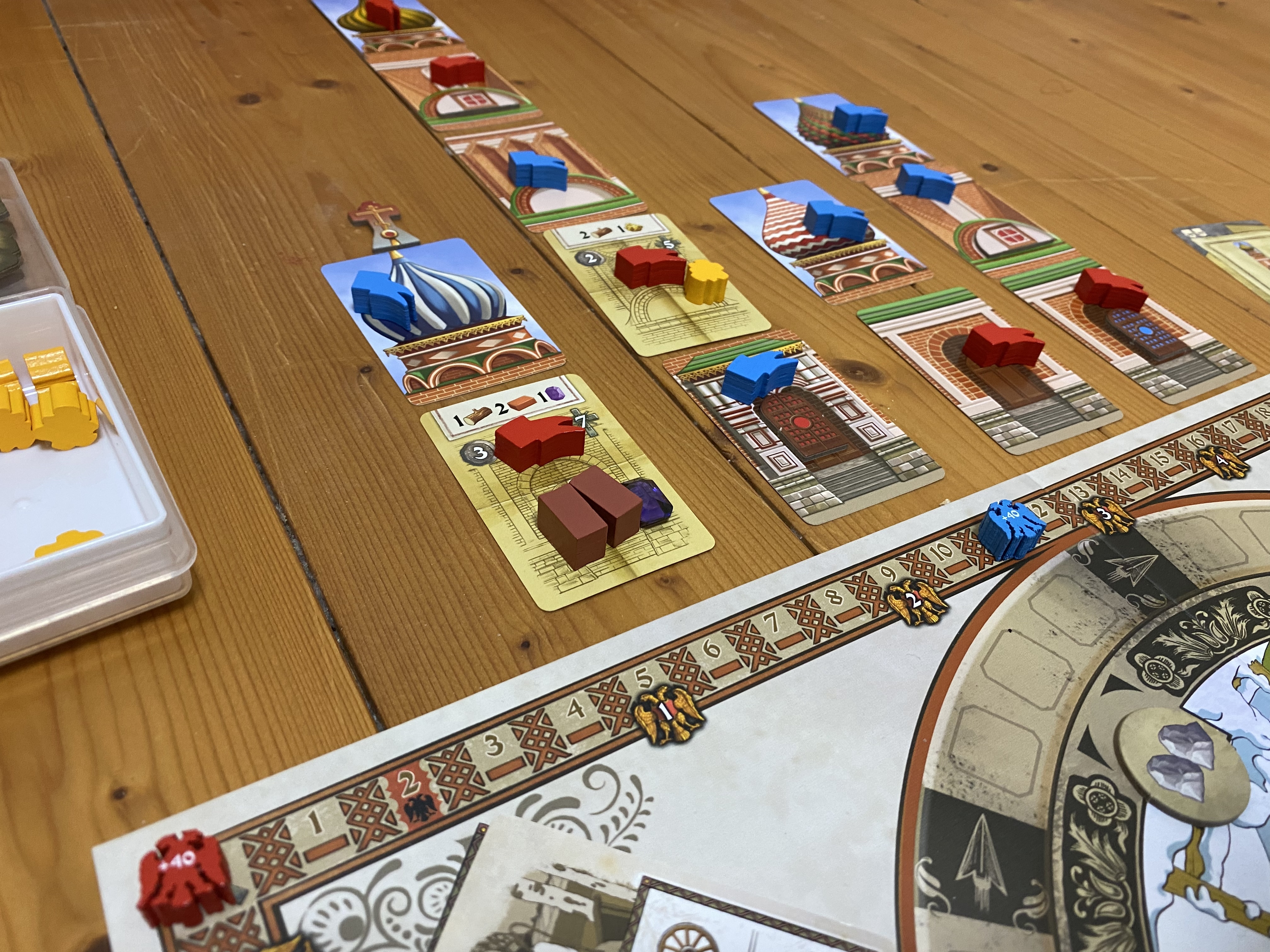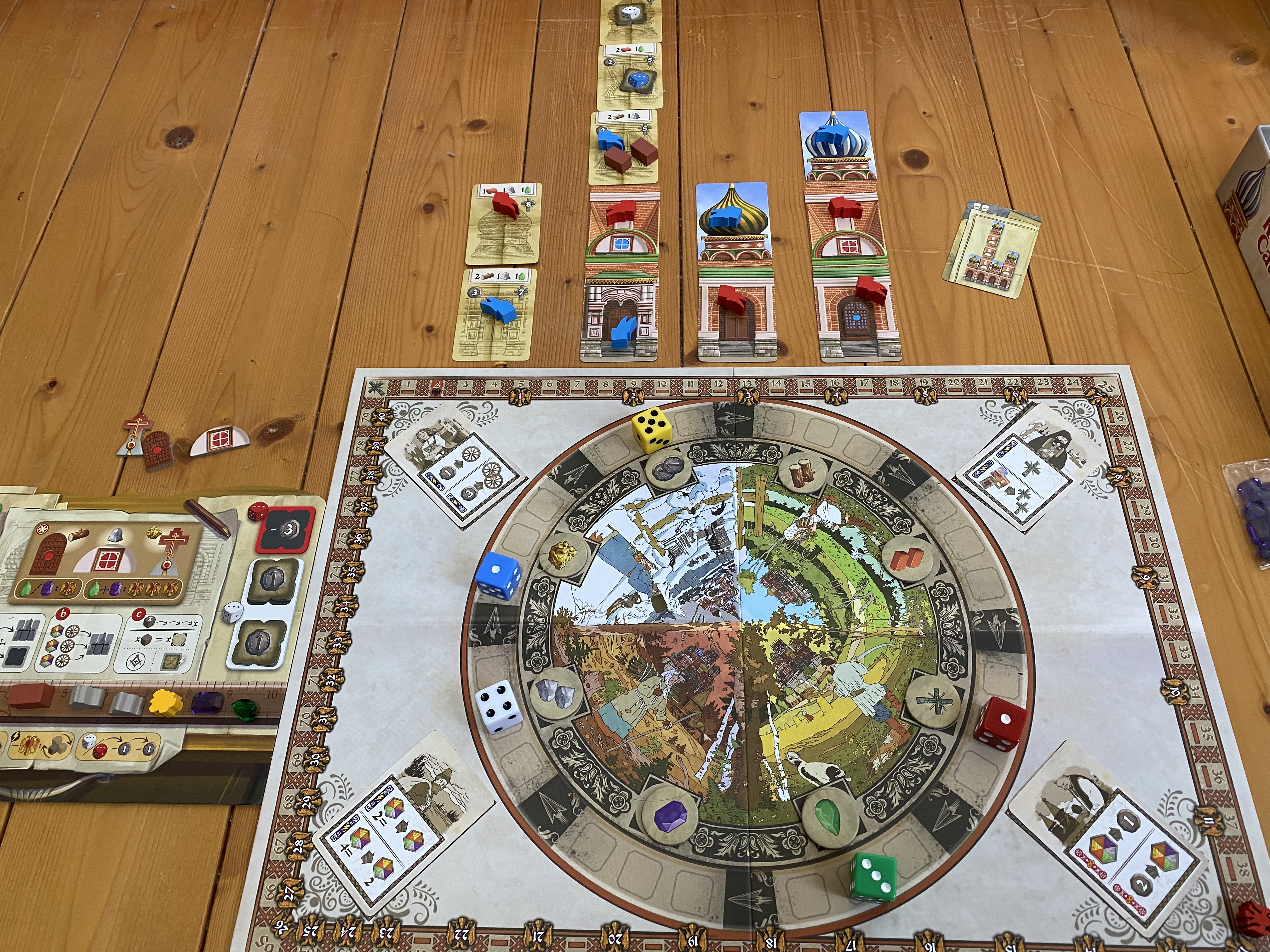 中身も「建設予定パーツを押さえつつ資材置き場解放し、更に工房ゲットしてアクション強化だぜ!」とか「このダイス回せばここに入ってダイス2個になるから4ルーブルもらいつつそのうち3ルーブル払って資材運び込み!予定パーツ完成で更に3ルーブル+6勝利点だ!」とか堪らんです!コイツ何言ってるんだ?と思われるのを覚悟で言ってますが 笑
