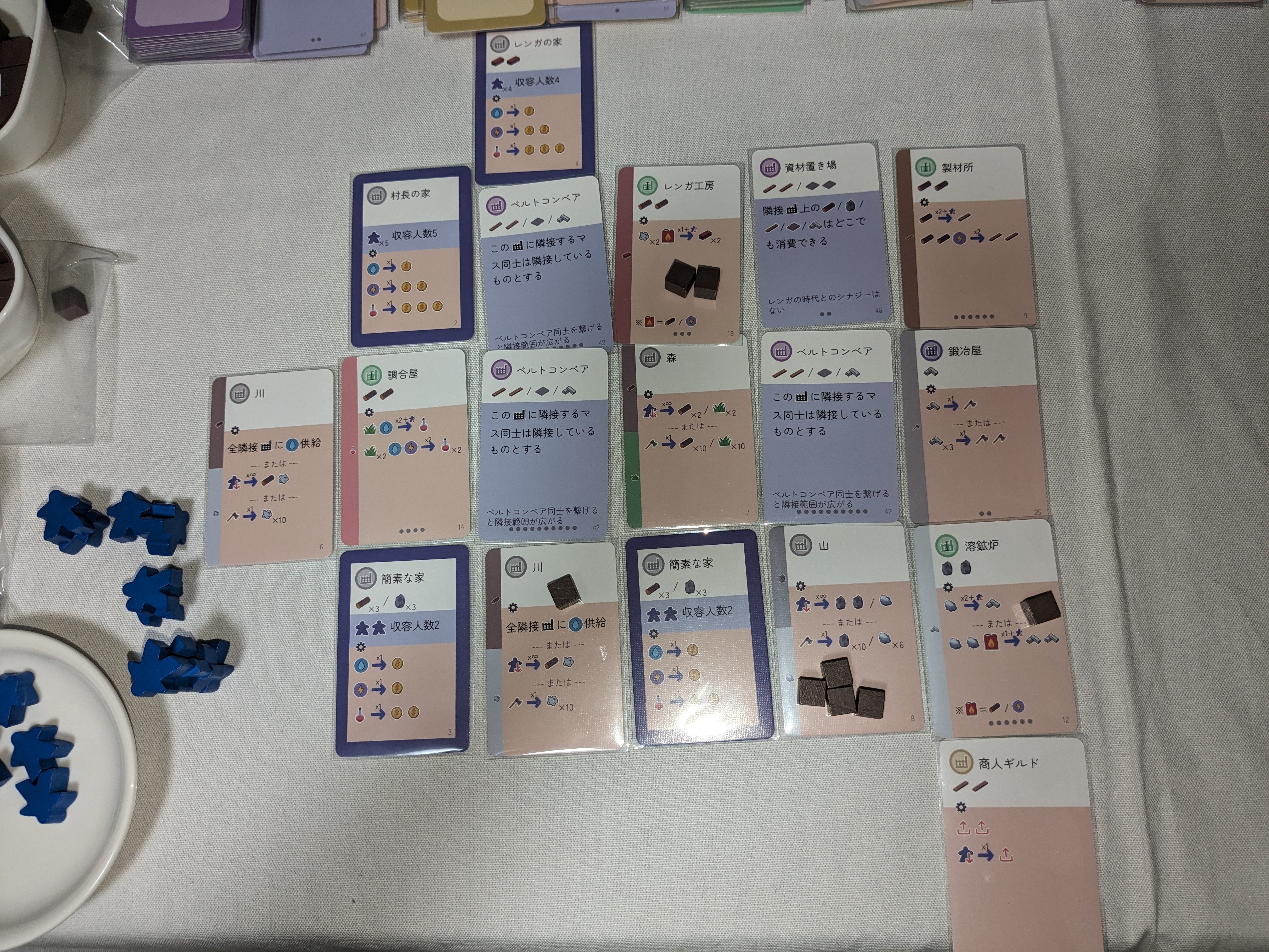 長々と紹介しましたがこれがプレイしてみるとすっきりと遊べます。特に相手を攻撃する要素はありませんが、建物に使う必要建材が、誰かか建物を建てる度にころころ変わる程度です。