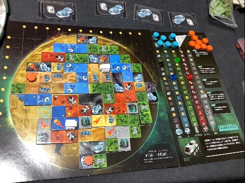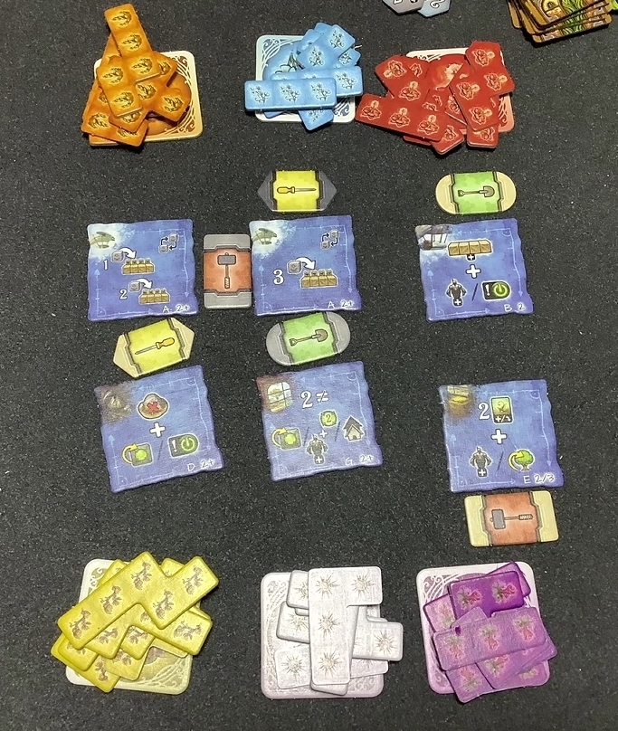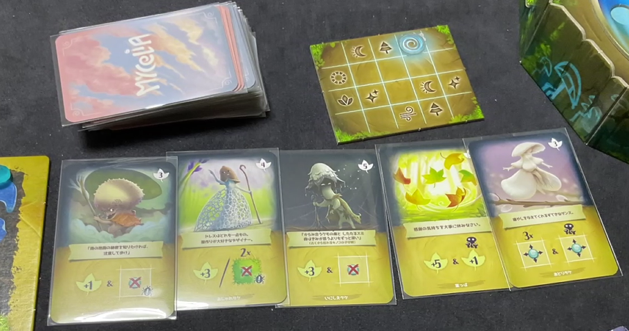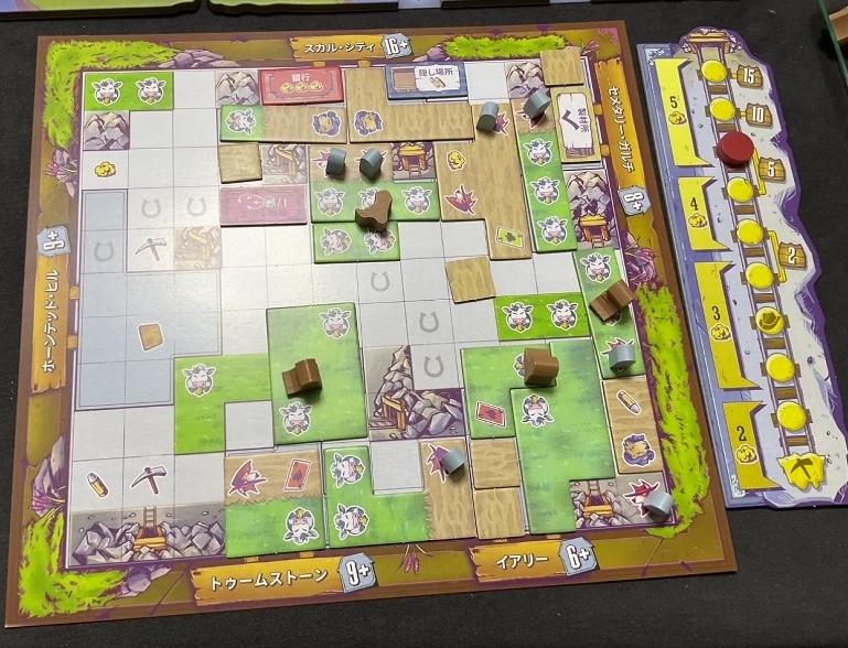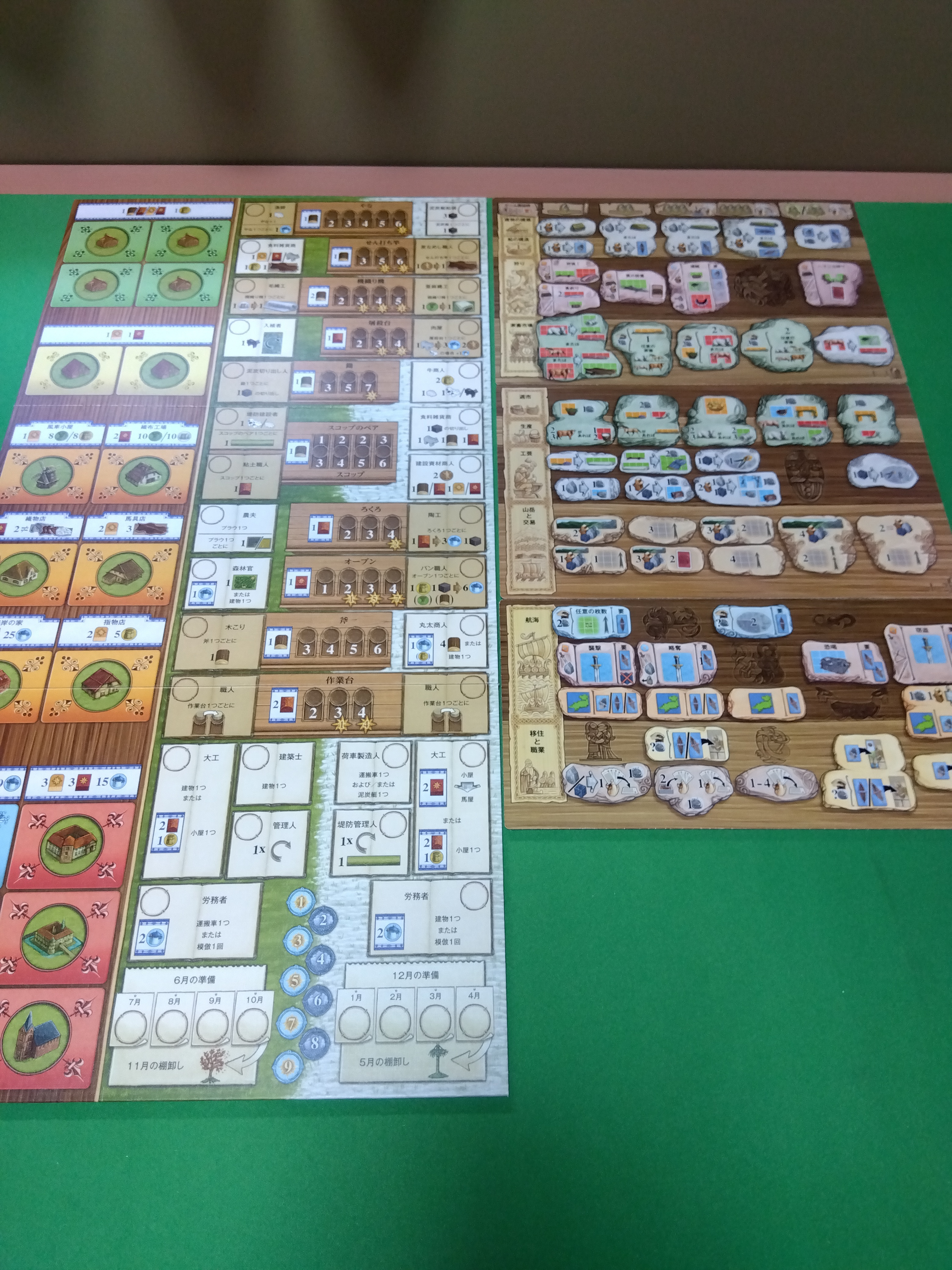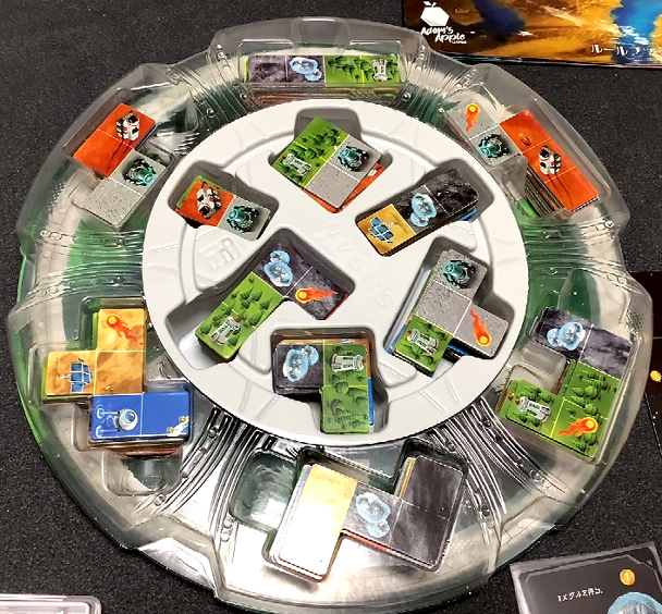 真ん中はちょっと特殊でして・・・これも一枚のボードではなく横長のタイルが5枚繋がっているのでゲーム毎に場所や位置が変わります。