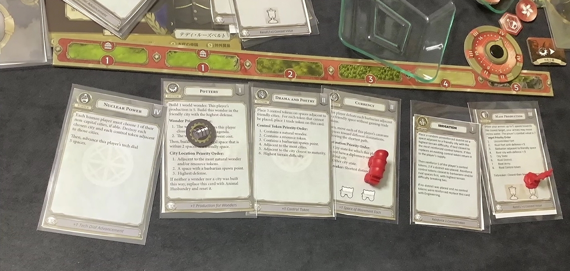 プレイは手札7枚から各プレイヤー5枚をプレイするとラウンド終了します。賃金を払ったり、もらったり、物資を生産したり支払ったりをした後で、国家の法律を変える投票が行われます。