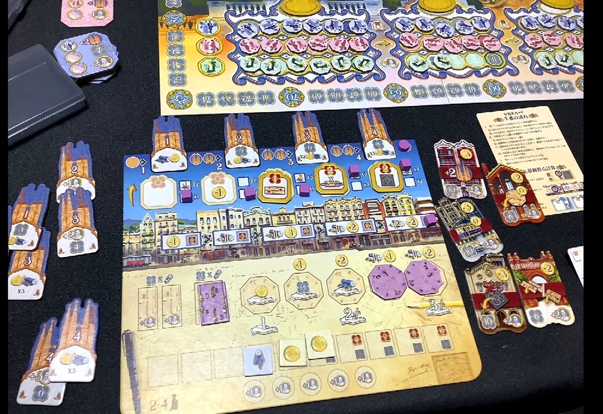 そして建材を手に入れて、建物を建てて真ん中のボードにタイルを置いたり、絵画の相場を操作して、売ったり買ったりして勝利点とお金を稼いだり