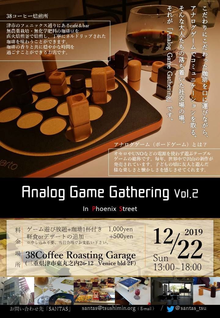 | 詳細内容 | 11月に開催したAnalog Game Gathering vol.1! 今月も継続して開催させていただきます! Analog Game Gathering Vol.2 開催です! 前回の様子はコチラ 前回同様のお値段ですが、ドリンクは珈琲以外もお飲みいただけます。 またフードは普段からサンパチ珈琲さんが販売している物を同じように出していただけます! 駐車場はSANTASの駐車場をお使い下さい。 |