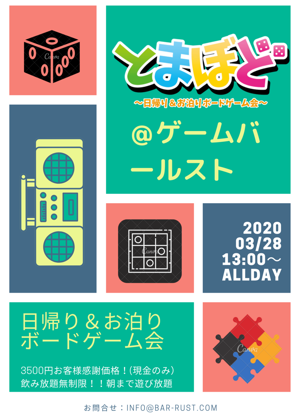 | 詳細内容 | 日帰り&お泊りボードゲーム会! 【月例】とまぼど日帰り&お泊りボードゲーム会 in ルスト #03 みんなでがっつり軽いゲームから重たいゲームまで遊んじゃいませんか。 お客様感謝DAYとして、アルコール/ソフトドリンクすべて飲み放題の3500円で 終日遊び放題!! お菓子盛り合わせも用意しております。 ※この日のみ途中入退室(外出)可能です(入退室を歓迎はしませんが、外出して食事や所用での退室後料金不要で再入店可能です) 3月28日 13時~ 3月29日 未明 ご予約、お問合せお待ちしております。 <前回とまぼどで遊ばれたゲームのリスト一部> 人狼ゲーム |