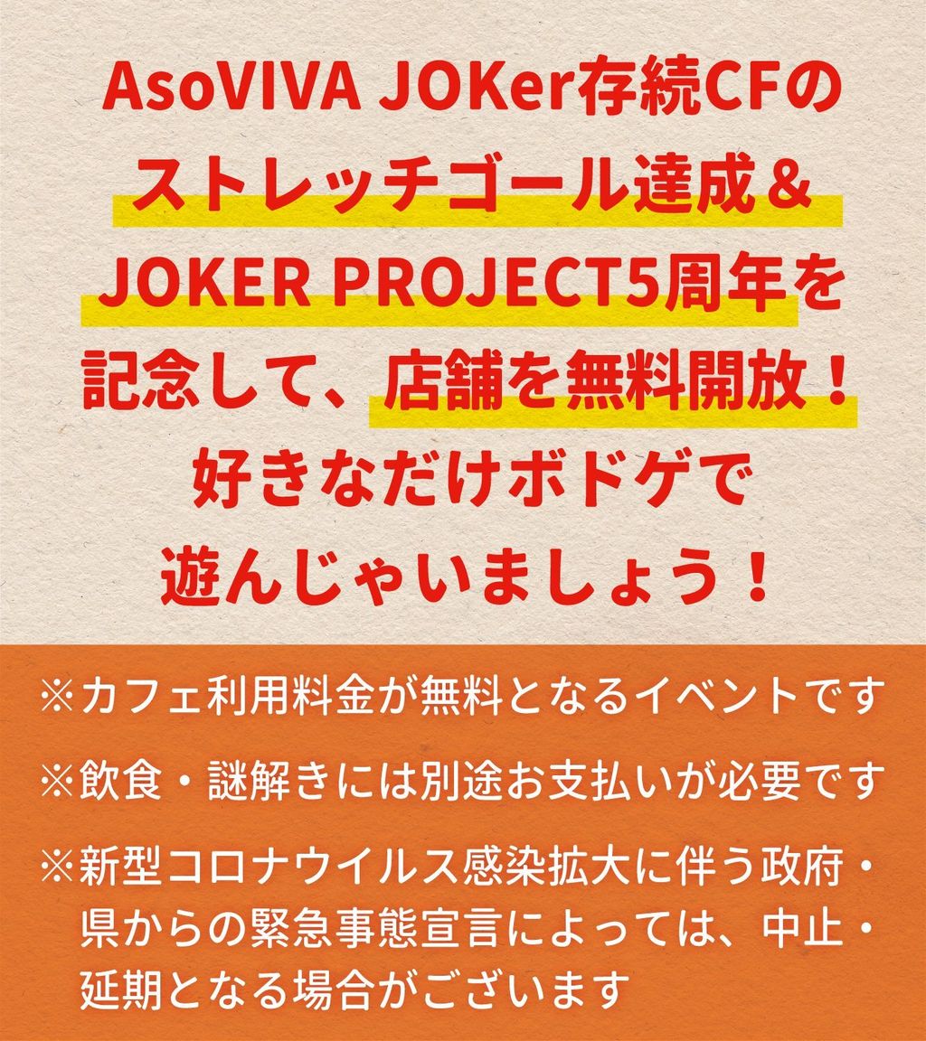 | 登録先カフェ/店舗 | ボードゲーム&謎解き AsoVIVA JOKer |
