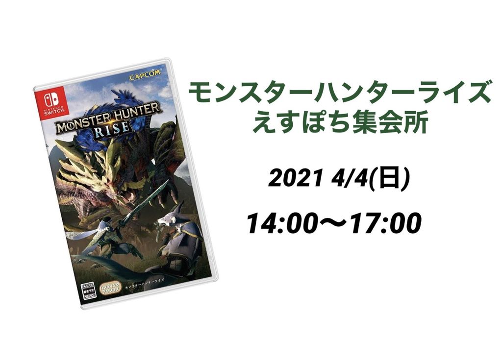 | 詳細内容 | モンスターハンターライズえすぽち集会所で、みんなで一狩行こうぜ! オンラインもいいけど、オフラインでわちゃわちゃしながら狩りに出掛けてみない? Switchとモンハンライズ持参の上、お待ちしております |