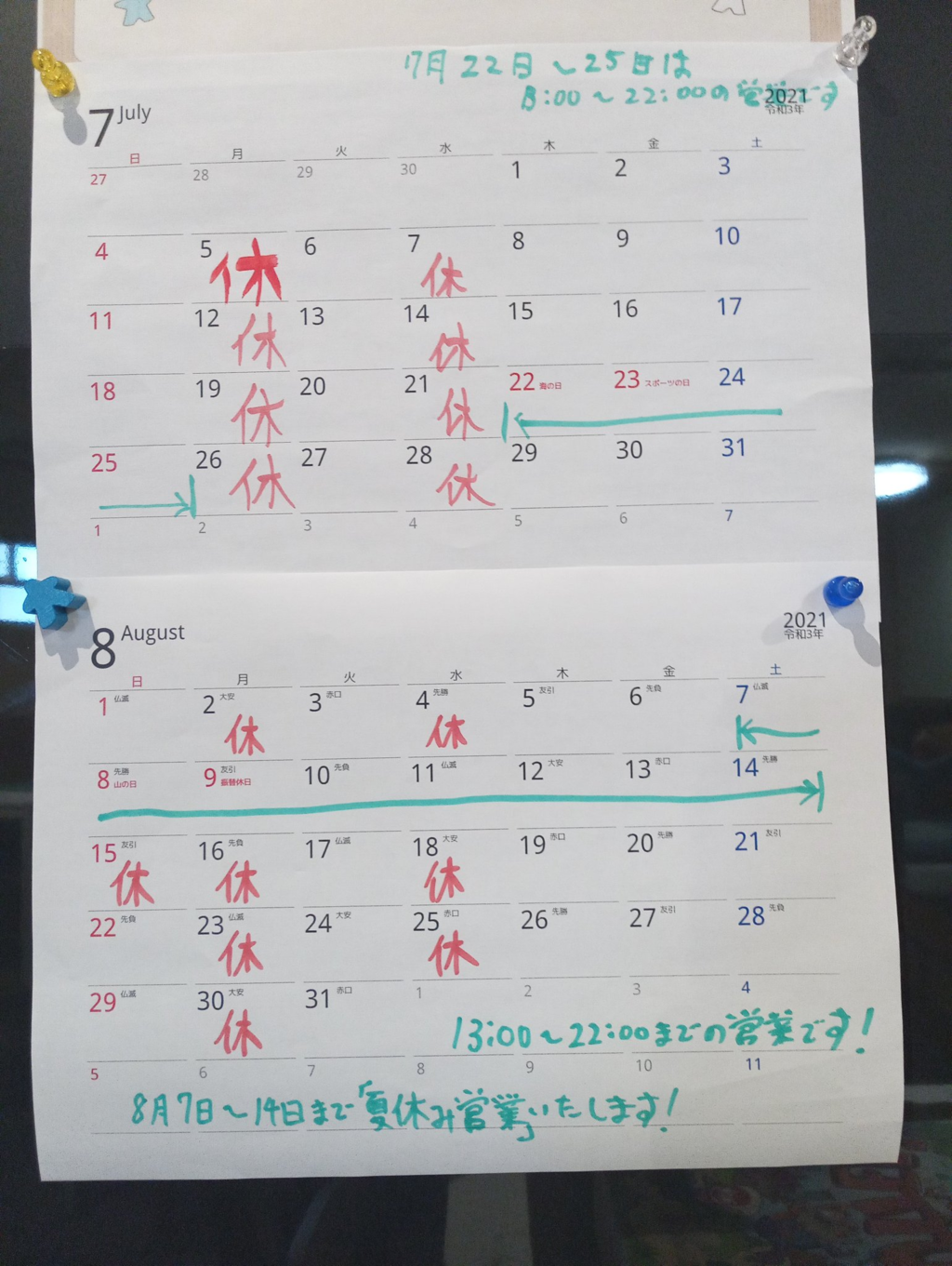 | 詳細内容 | [お知らせ] 7月22日から7月25日と 8月7日から8月14日は 13:00~22:00まで営業いたします! ぜひ遊びにおいでください! |