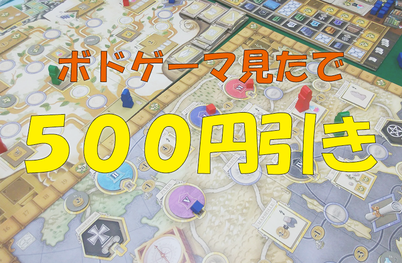 | 詳細内容 | イベント概要 ボドゲーマをご覧のお客様限定のサービスです。 ご来店時に「ボドゲーマ見た」とスタッフに伝えると、 なんとお会計が500円引きとなります! 是非この機会にご利用ください。 参考通常料金 3時間:1100円 5時間:1500円 10時間:2500円