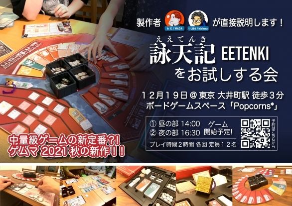 Q. 1人で参加しても大丈夫? A. もちろんです! Q. 本当にお試しって感じでお邪魔してもOK? A. はい、冷やかし参加大歓迎です!見学もどうぞ! Q. ゲームは難しいですか?自分に合うか不安... A. 正直にいうと、詠天記は「誰でもパッとできる軽いゲーム」ではありません。しかし、遊ばれた方のほとんどは「一度やったらもうルールが頭に入る」と分かりやすさを評価してくださっています。これまでのテストでは、男女、年齢問わず、幅広い層に好評いただいています。よろしければ、以下のゲーム紹介ページからルールの概要や説明書をご覧いただくことができます。 http://eetenki.com 問い合わせ先 Twitter:https://twitter.com/ACCIR2019 Mail:accentcirconflexe2019@gmail.com