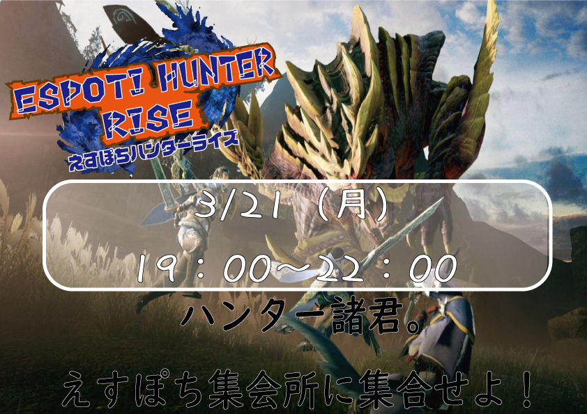 | 詳細内容 | 3/19(土) 19時スタート『ポケモンユナイト交流会』 3/21(月) 19時スタート『えすぽちハンターライズ』 どちらもご参加おまちしております! |