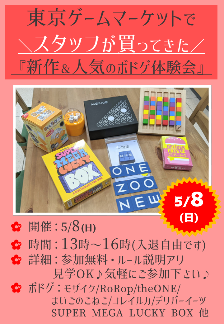 | 詳細内容 | 【イベント詳細】 開催日:5/8(日) 作品:モザイク/RoRop/theONE/まいごのこねこ/コレイルカ/デリバーイーツ など 開催時間: 13:00~16:00入退場自由 参加費:無料 内容:スタッフがゲームマーケットで気になって買ってきたボードゲームであそべます。