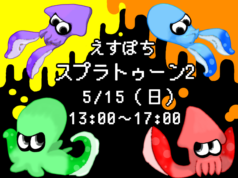 | 詳細内容 | スプラトゥーン2会やります!みんなで戦いませんか? えすぽちでチーム戦で挑むか、もしくはチーム戦でみんなで戦うか switch&スプラトゥーン2持参でお待ちしております。 ![]() |