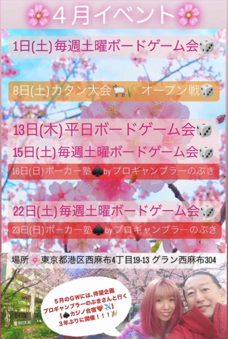 | 詳細内容 | 【ボドゲアイドルあやみん&プロギャンブラーのぶきさんと遊ぶボードゲーム会🎲】@渋谷 4/13(木) 11時~23時 途中参加&退出OK👌未経験者、ボードゲーム持込も大歓迎🎶